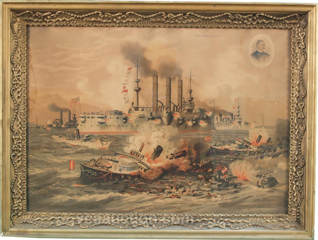 Original 1898 Print - The Destruction of Admiral Cervera's fleet in the Spanish - American War, Cuba Blockade in ornate frame - 32" x 24"