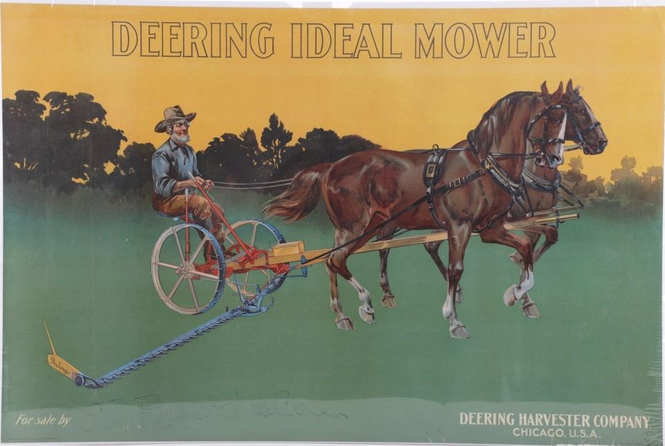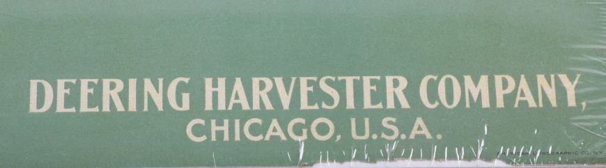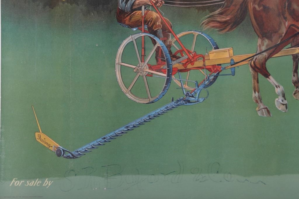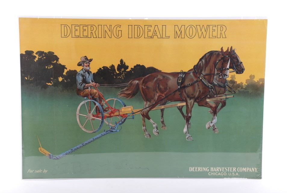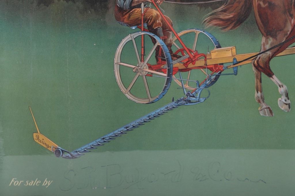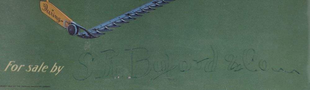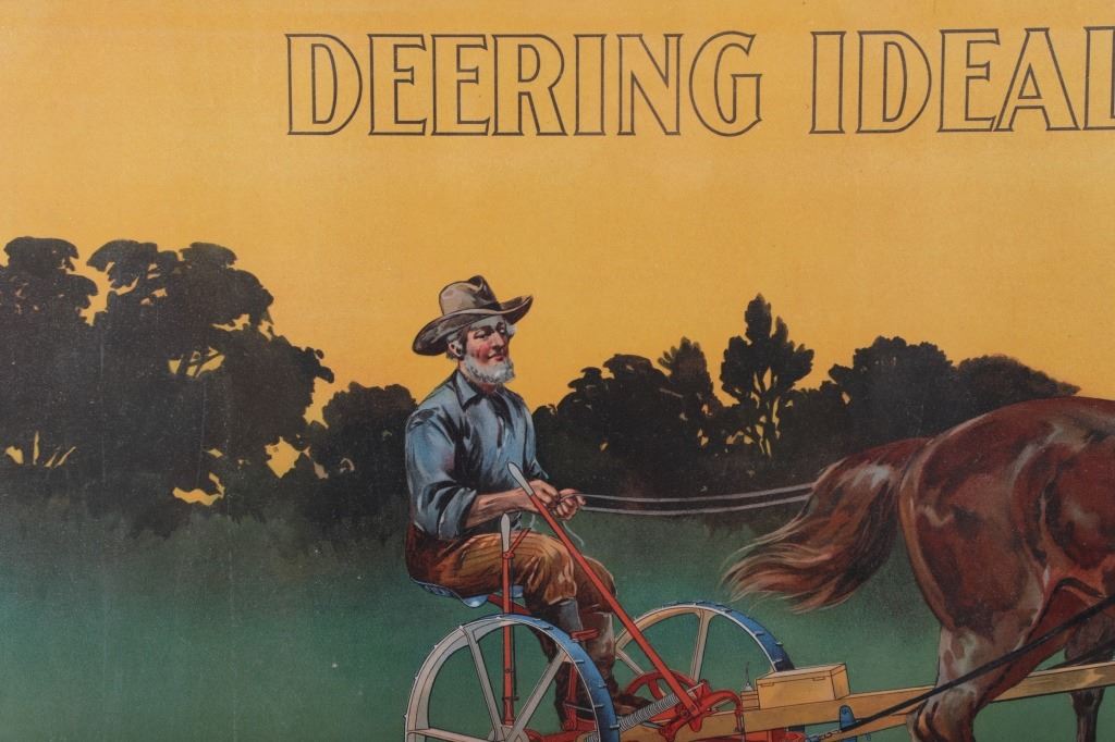 For your consideration is this original 1900 Deering Harvester Company poster from S.R. Buford & Company in Virginia City, Montana. S.R. Buford & Company was a dealer for Deering as well as Mitchell Wagons in Virginia City, Montana during the late 1800's to early 1900's. The piece shows a wonderful lithographed image of a farmer driving a sickle mower pulled by a team of horses. The top reads "Deering Ideal Mower" and the bottom reads "For Sale by S.R. Buford & Co. / Deering Harvester Company, Chicago, U.S.A.". The bottom left corner reads, "Copyright 1900 by the Deering Harvester Company". This early piece of advertising is in great condition considering it is over 120 years old. The advertisement is set on a large piece of foam board and is sealed with plastic to preserve its condition. It measures 19 7/8" L x 30" w.