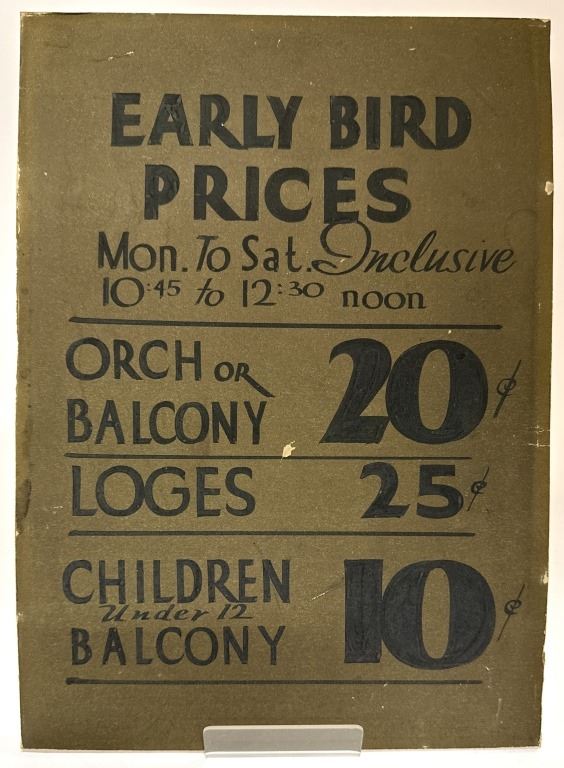 Item/Description: Original antique 1920s theater sign featuring 'Early Bird Prices' for various theater seats and boxes.