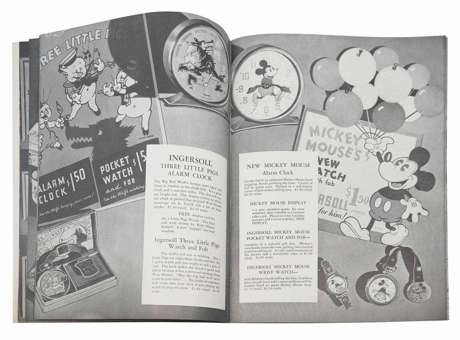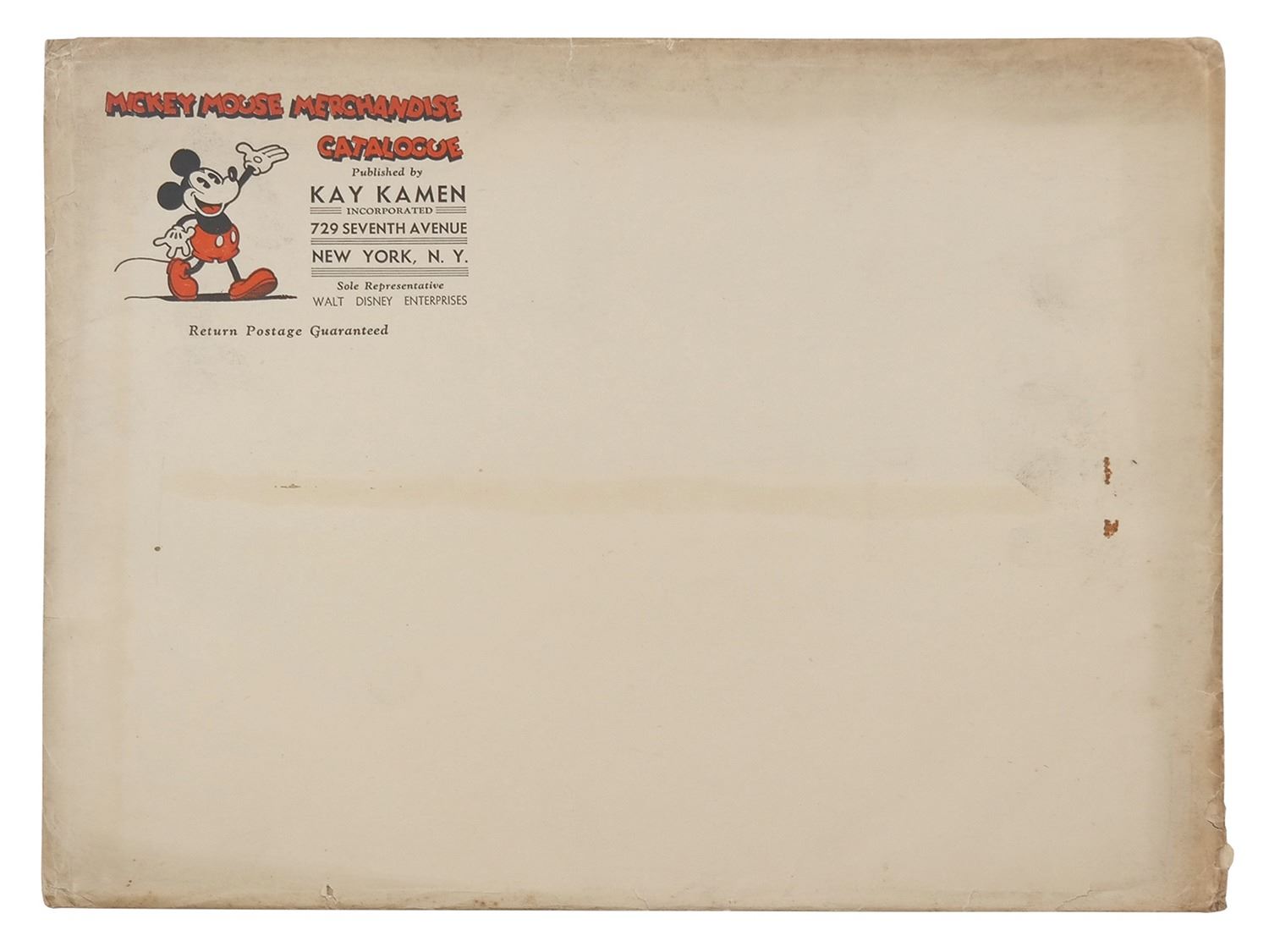 (Disney, 1934) An incredibly rare Walt Disney Enterprises merchandise catalog published by Kay Kamen, Inc. in 1934. The 76-page catalog showcases the variety of licensed Mickey Mouse products available to retailers across the world through beautiful black and white photos and descriptions. This was Kamen's first published Disney catalog and it not only showcases the brand power of Mickey Mouse, but also the enormous success Kamen had in licensing products for the studio. Measuring 12"x9", the catalog is in very fine condition with minor cover wear, and comes with the original mailing envelope. The envelope is worn with some small tears. The inner cover page has a label from Richmond School Furniture Co., one of the listed manufacturers within the catalog. This is an extremely rare piece of Disney history.