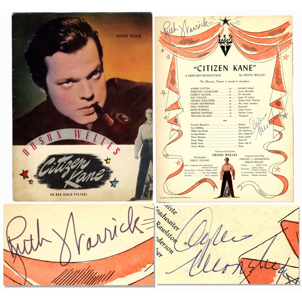 Rare 1941 signed souvenir program from the film that forever changed the world of cinema, Orson Welles' ''Citizen Kane.'' 10pp. booklet, front and verso, includes various photos from the set, candid shots, and narrative details about Welles' biography, as well as his process in making his magnum opus which he wrote, produced and starred in. Signed ''Ruth Warrick'' and ''Agnes Moorehead'', both boldly in black ink to cast listing page. Moorehead played Kane's mother and Warrick, his first wife. Copyright 1941 by RKO Radio Pictures, program sold for 25 cents, as is printed on verso of cover. Measures 9'' x 12'' with minor scuffing to covers, else near fine condition.