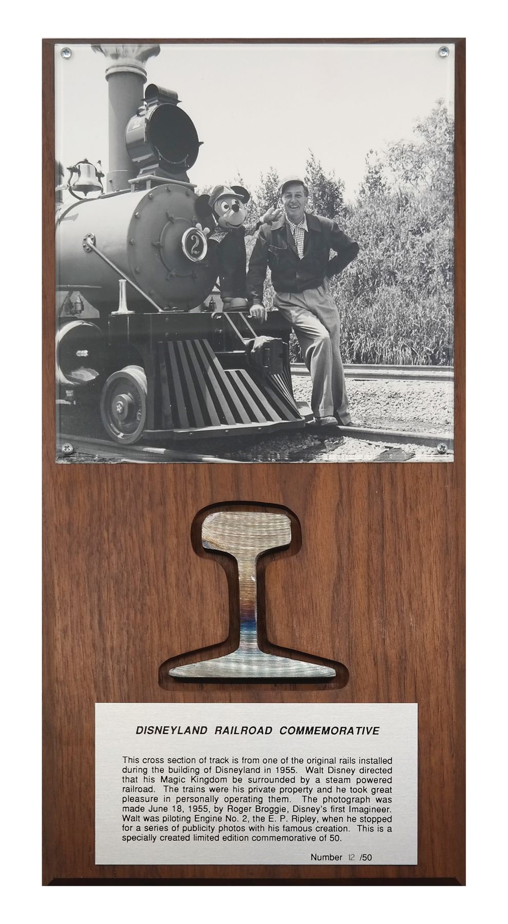 (Disneyland, 1955) A rare cross section of track from one of the original rails installed during the construction of Disneyland in 1955. The 3"x3" and 0.75" thick cross section of track has been placed in a limited edition commemorative wooden plaque with a 7.5"x7.5" photo of Walt Disney in front of the E.P. Ripley locomotive, with a 3"x6" metal plaque along the bottom. The entire piece measures 16"x8.25" and was released in an edition of only 50 pieces, of which this is number 12. An exceptional piece of Disneyland Railroad history, the plaque and track are in very fine condition with only minimal wear.