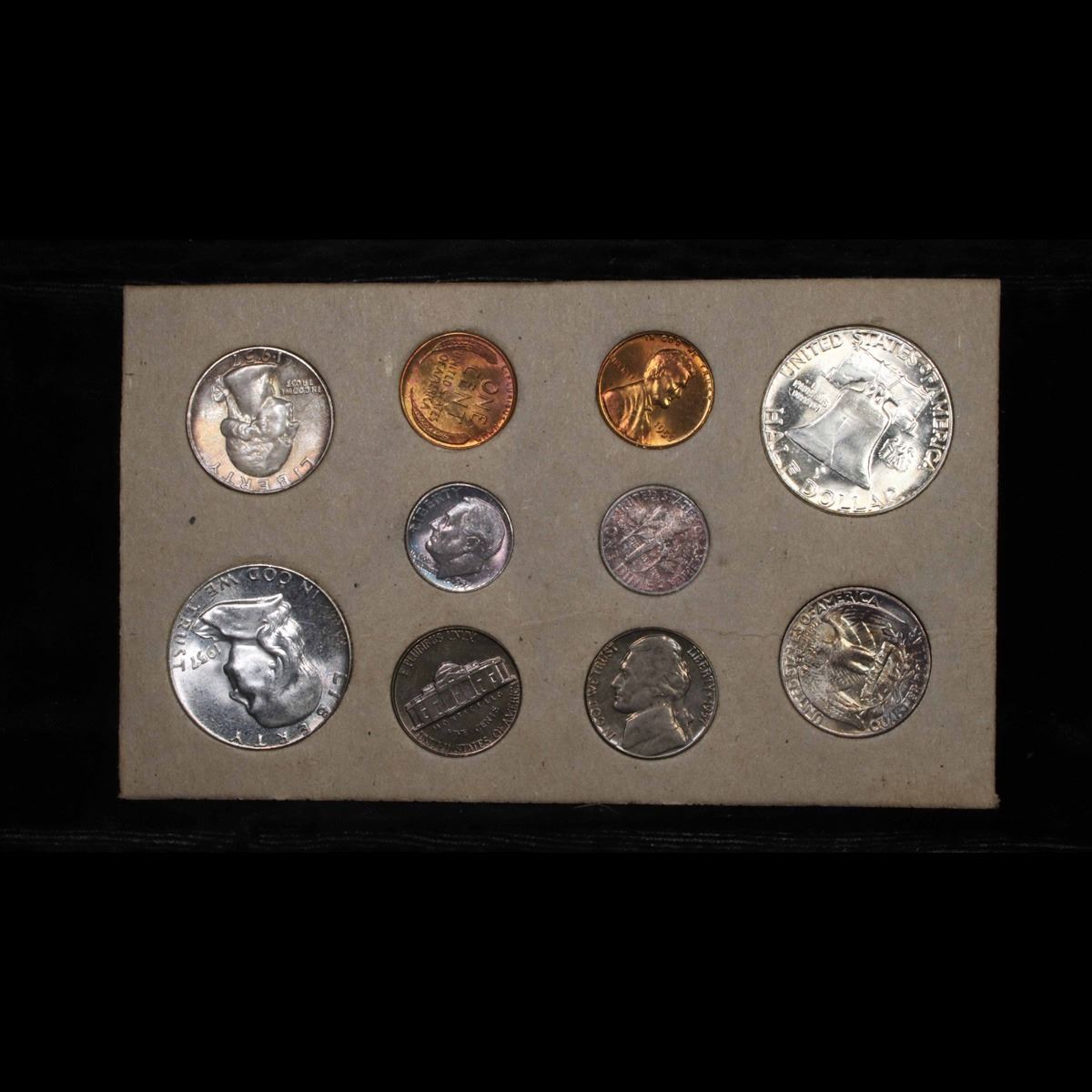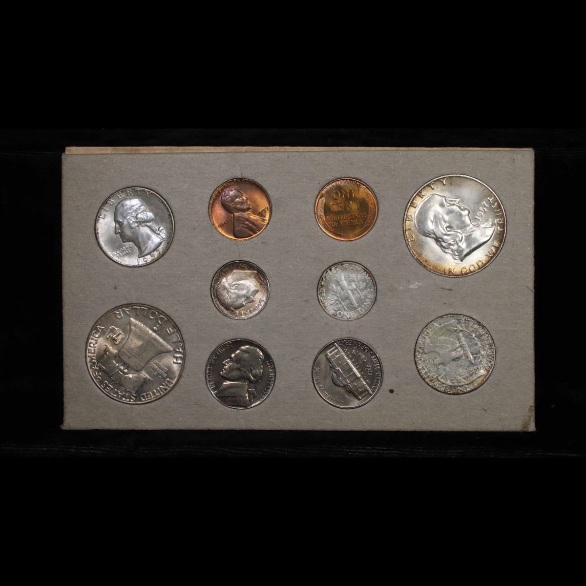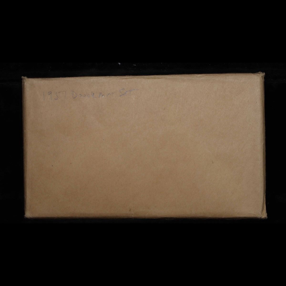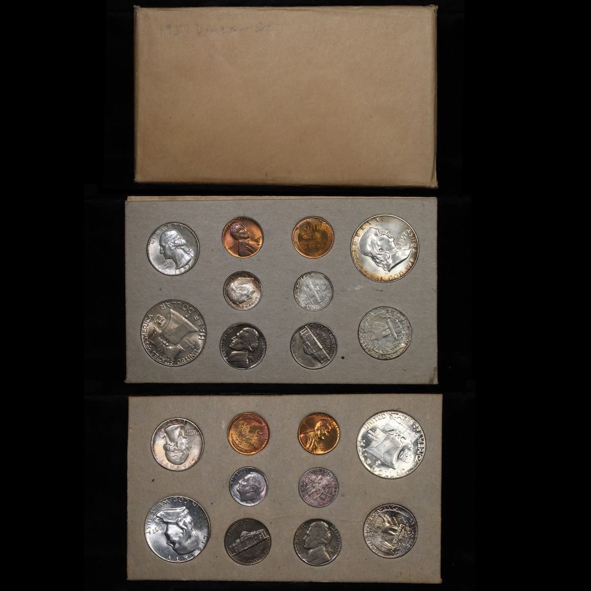 Original 1957 Double Mint Set and includes 20 coins. This is a beautiful 1957 Double silver mint set and includes 2 of each coin minted for 1957. This lot includes 20 coins, the full p, and d runs. The 'p' run has: 2 Franklin halves, 2 Washington quarters, 2 Roosevelt Dimes, 2 Jefferson nickels and 2 lincoln cents; the 'd' run has 2 Franklin halves, 2 Washington quarters, 2 Roosevelt dimes, 2 Jefferson nickels and 2 Lincoln cents. The coins are in the original cardboard holders with attached paper flaps as issued by the mint. Each holder contains two examples of each coin from the mint where is was made. The holders were placed in storage and shipping envelopes. As in previous years, the sulfur content of the packaging often resulted in distinctive toning on the coins. This is a great original 1957 mint set. Very nice and tough set.
