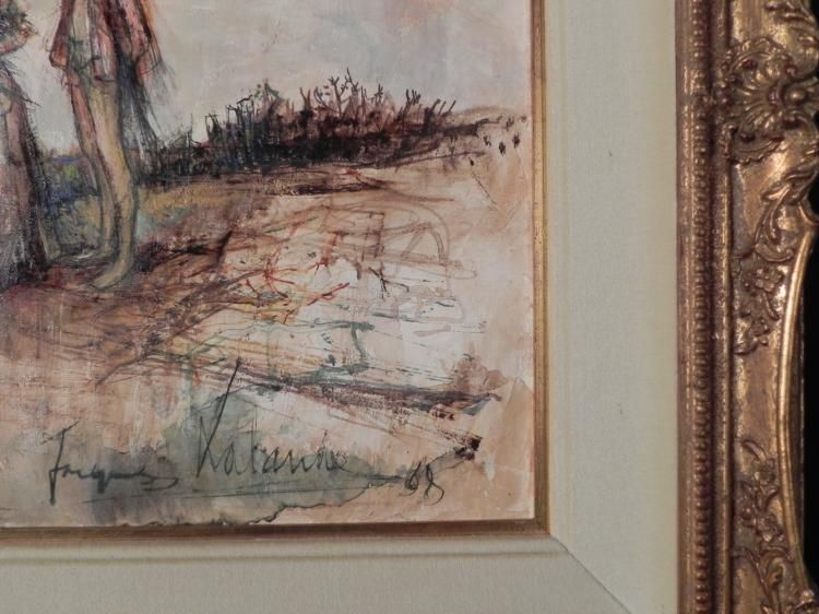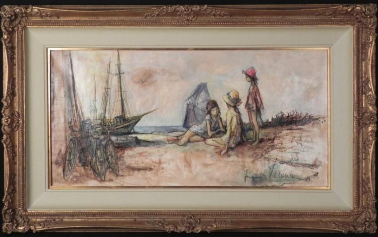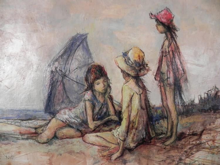 This painting portrays 3 children who have just ridden their bicycles to a sandy shore, with a boat in the background. The figures are line drawn, with a sketch quality overall. Artist: Signed, lower rightDate: 1968, dated lower rightMedium: Acrylic on canvasImage size: 15 x 30 1/2 inchesFraming: In decorative gold painted frame, with gold inner border, and ivory velour matte areaFrame size: 25 x 40 1/2 inchesCondition: Excellent