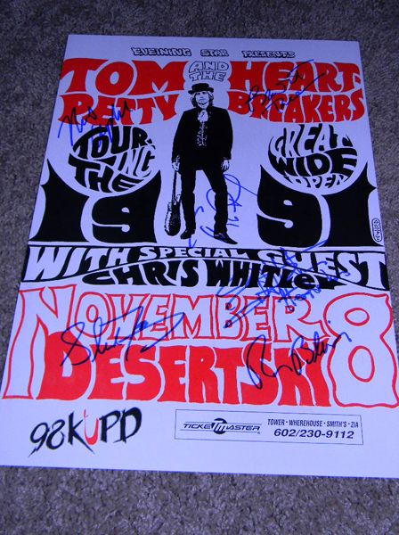 Original concert poster from Touring the Great Wide Open tour in 1991. Signed by Petty and all five of the Heartbreakers band. This item comes with a certificate of authenticity good for the life of the piece.