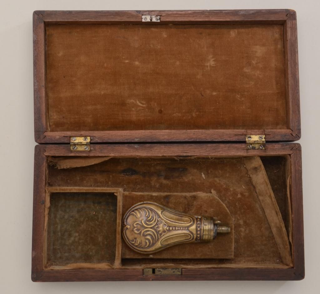 Original 19th century pistol case for pepperbox or revolver, circa 1850s-60s with American style pistol flask. The pistol would measure approximately 10" from muzzle to end of grip, with approximately 4-1/2 to5" barrels. The configuration of the case may be a Robinson and Lawrence, but we did not have an example to check fit. The inside of the case is lined in brown velveteen, the condition is fair to good and would improvewith slight restoration. The flask is good. The exterior of the case shows some cracks, small marks and mars, but is good. Est.: $350-$700