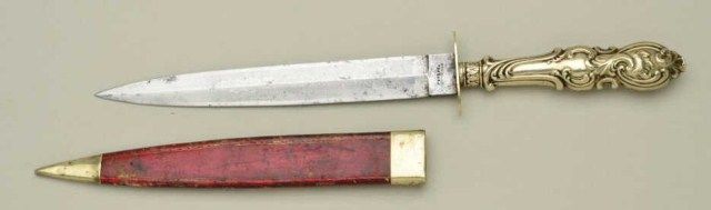 Original 19th century spear point Bowie knife with cutlery handle by “Rurb & B. Shefflield” with etched blade in slogan (never draw me without reason nor sheath me without honor) on left side of blade. Theblade measures 8“. The knife is 12-7/8” overall and shows most of its original bright polish just dulling slightly with beginning spotting and erosion and some minor pinprick pitting. The sheath is very good plus withits original tip and button hanger. There is a small bend to the tip of the pommel. A very attractive and original knife by an odd maker. Est.;$400-$800.