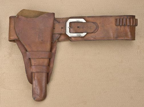 Original 19th to early 20th century rig consisting of holster, cartridge belt/money belt for Colt Single Action Army or 1878 DA and most other large frame western-style revolvers. This design would fit almostanything. The cartridge loops are for .32-20 caliber. The belt measures 3-1/4” in width. The holster is double-looped western style with a typical nickel plated harness type buckle. Holster is stamped “Rival”, tab isstamped “Crown”. Interior tab beneath buckle is stamped C24-1. We would date the rig 1890 to about 1915. Good to very good overall condition. Nice light color. Belt approx. size 36. Est: $800 - $1,600
