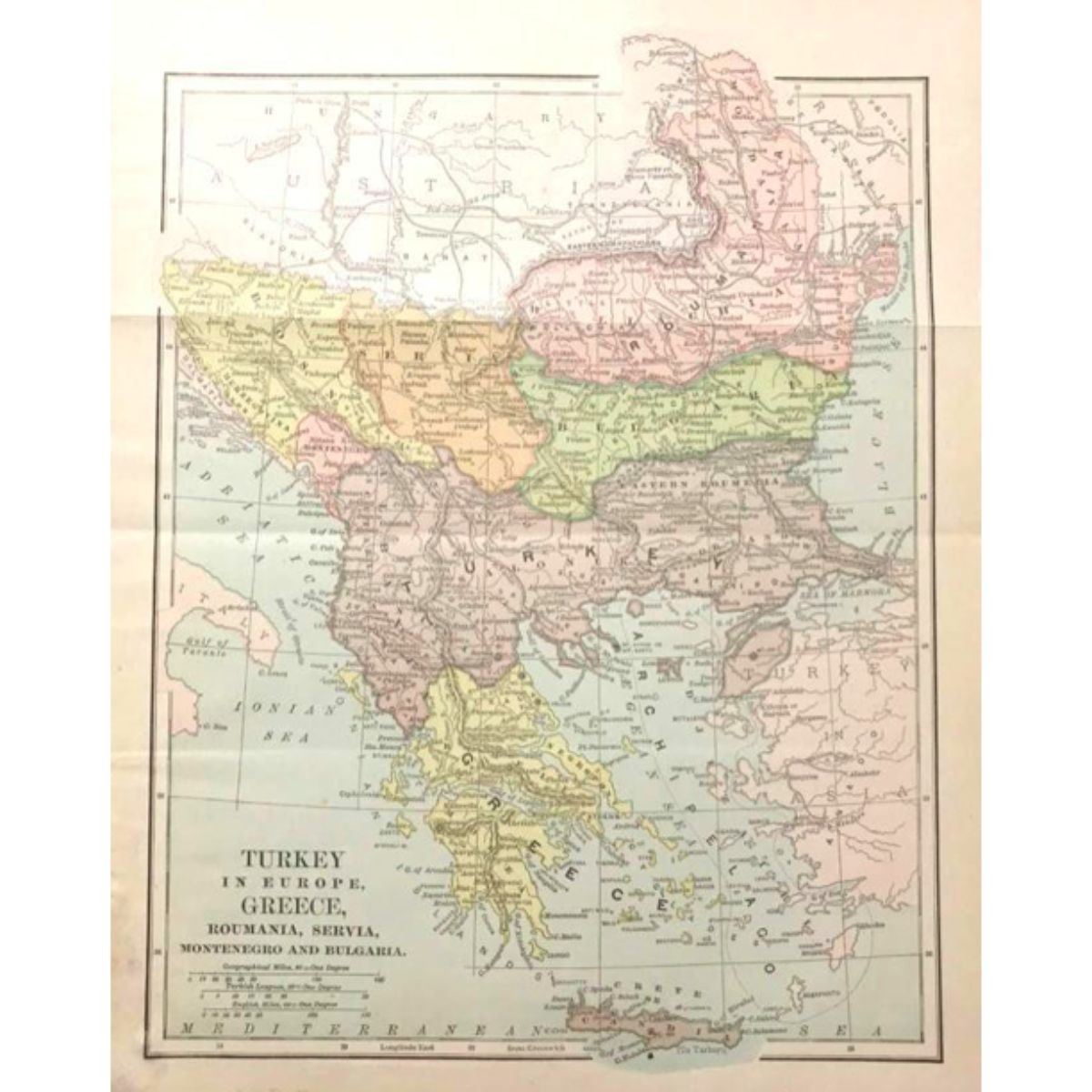 Original 1890's map of Turkey, Greece, Roumania, Servia, Montenegro & Bulgaria. Fold-out atlas map. 10" X 12 1/4".
