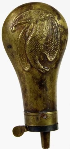 Original 2 oz powder flaskeagle on a hummock, with long left wing, by Copewell, flask remains in very good condition including powder cut off spring, 4 1/2", correct size for Colt Pocket model revolvers. From John Hunter collection. Est. 150-250
