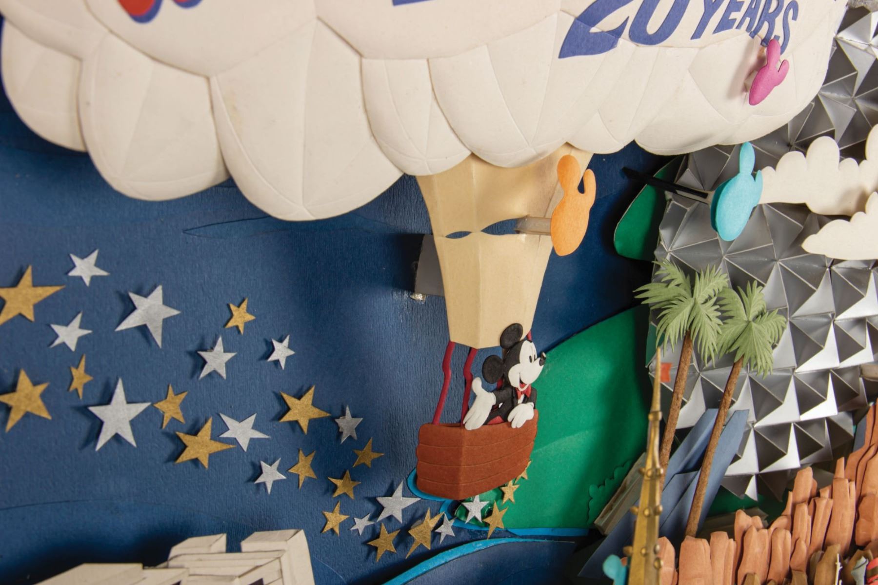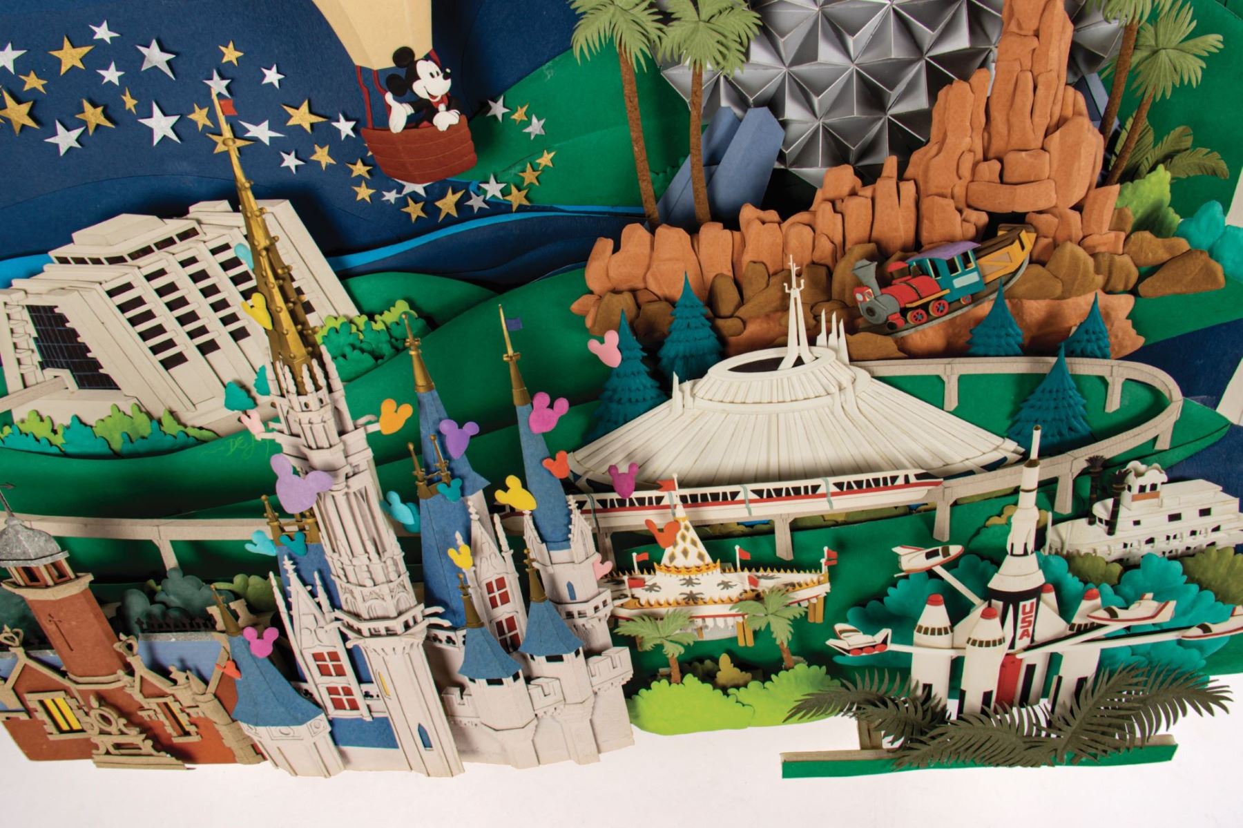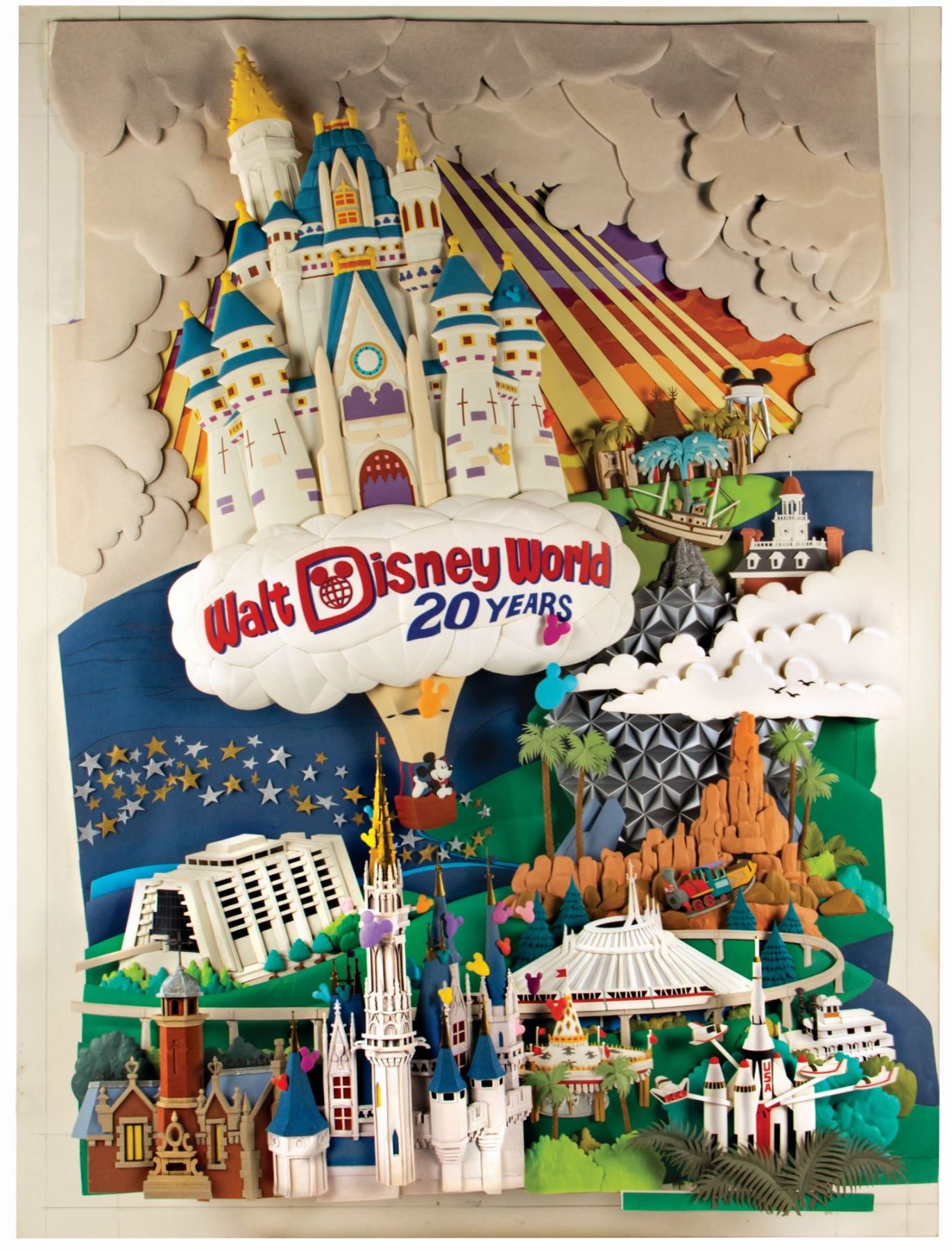 (Walt Disney World, c.1991) An original paper sculpture created by artist Dee DeLoy for the highly-regarded Walt Disney World 20th anniversary cast member lithograph titled "Where Dreams Take Flight." DeLoy has worked at Walt Disney World as a caricature artist in the Contemporary Hotel and as a figure finisher with WED Show Production for Epcot and Tokyo Disneyland. Later, DeLoy was asked to create the original artwork for the 20th anniversary cast member lithograph. This stunning 3 dimensional sculpture depicts the iconic landmarks of Walt Disney World such as Cinderella Castle, the Contemporary Hotel, Spaceship Earth, Big Thunder Mountain, Space Mountain, and much more. This original design took over 700 hours to draw, cut, assemble, and finish. This original artwork won a prestigious award from the Dimensional Illustrators in New York, and DeLoy has been honored with more than 16 additional awards for paper sculpture and has been featured in the book More Paper Sculpture by Kathleen Ziegler and Nick Greco. Measuring approximately 38"x29" and 7" deep, this one-of-a-kind sculpture beautifully captures the attractions and entertainment found at Walt Disney World. The condition is very fine, and this paper sculpture includes a signed Artist's Proof for the lithograph the sculpture was used to create. A few small paper details, such as additional stars and balloons, have been added by DeLoy since the image was used for the lithograph. This item will require special shipping arrangements. Please contact us for details and estimates.