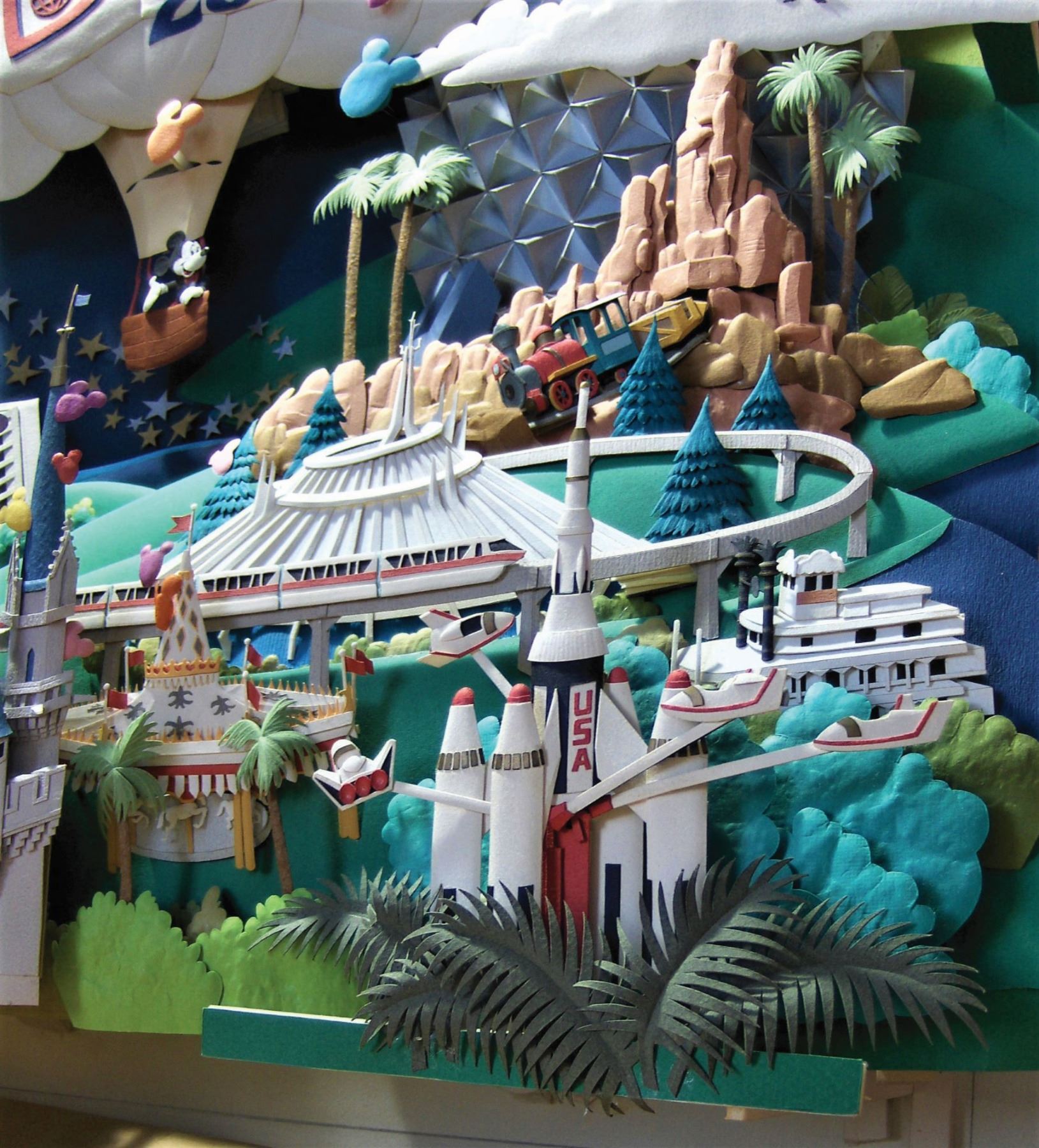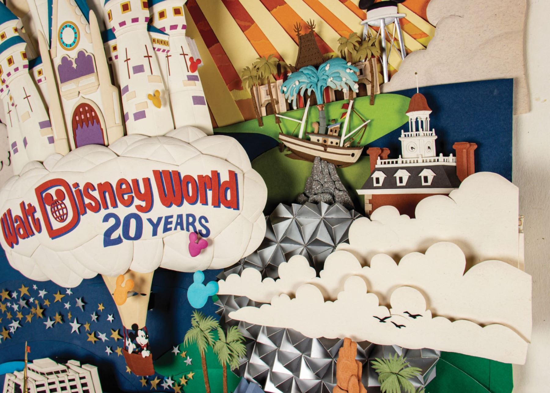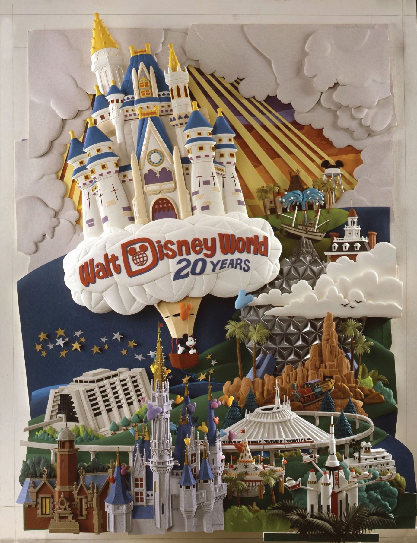 (Walt Disney World, c.1991) An original paper sculpture created by artist Dee DeLoy for the highly-regarded Walt Disney World 20th anniversary cast member lithograph titled "Where Dreams Take Flight." DeLoy has worked at Walt Disney World as a caricature artist in the Contemporary Hotel and as a figure finisher with WED Show Production for Epcot and Tokyo Disneyland. Later, DeLoy was asked to create the original artwork for the 20th anniversary cast member lithograph. This stunning 3 dimensional sculpture depicts the iconic landmarks of Walt Disney World such as Cinderella Castle, the Contemporary Hotel, Spaceship Earth, Big Thunder Mountain, Space Mountain, and much more. This original design took over 700 hours to draw, cut, assemble, and finish. This original artwork won a prestigious award from the Dimensional Illustrators in New York, and DeLoy has been honored with more than 16 additional awards for paper sculpture and has been featured in the book More Paper Sculpture by Kathleen Ziegler and Nick Greco. Measuring approximately 38"x29" and 7" deep, this one-of-a-kind sculpture beautifully captures the attractions and entertainment found at Walt Disney World. The condition is very fine, and this paper sculpture includes a signed Artist's Proof for the lithograph the sculpture was used to create. A few small paper details, such as additional stars and balloons, have been added by DeLoy since the image was used for the lithograph. This item will require special shipping arrangements. Please contact us for details and estimates.