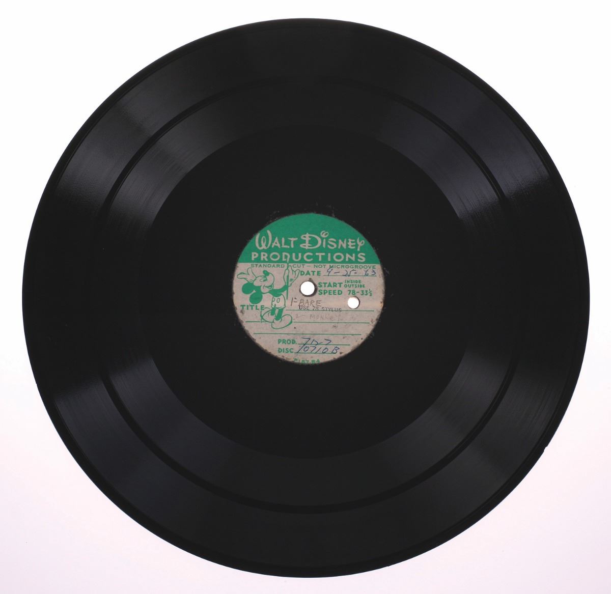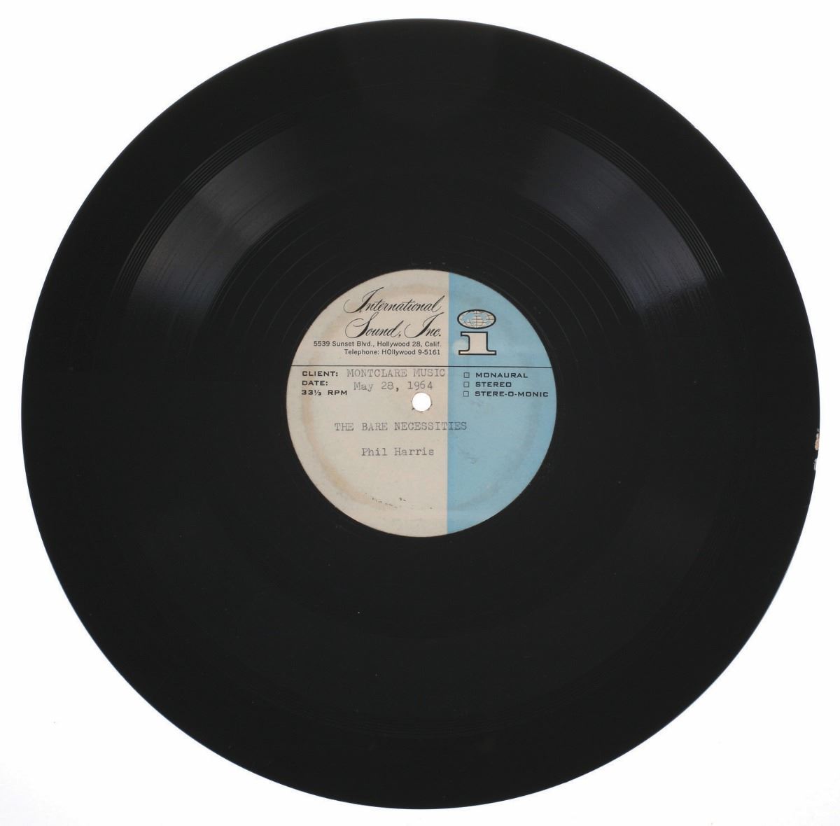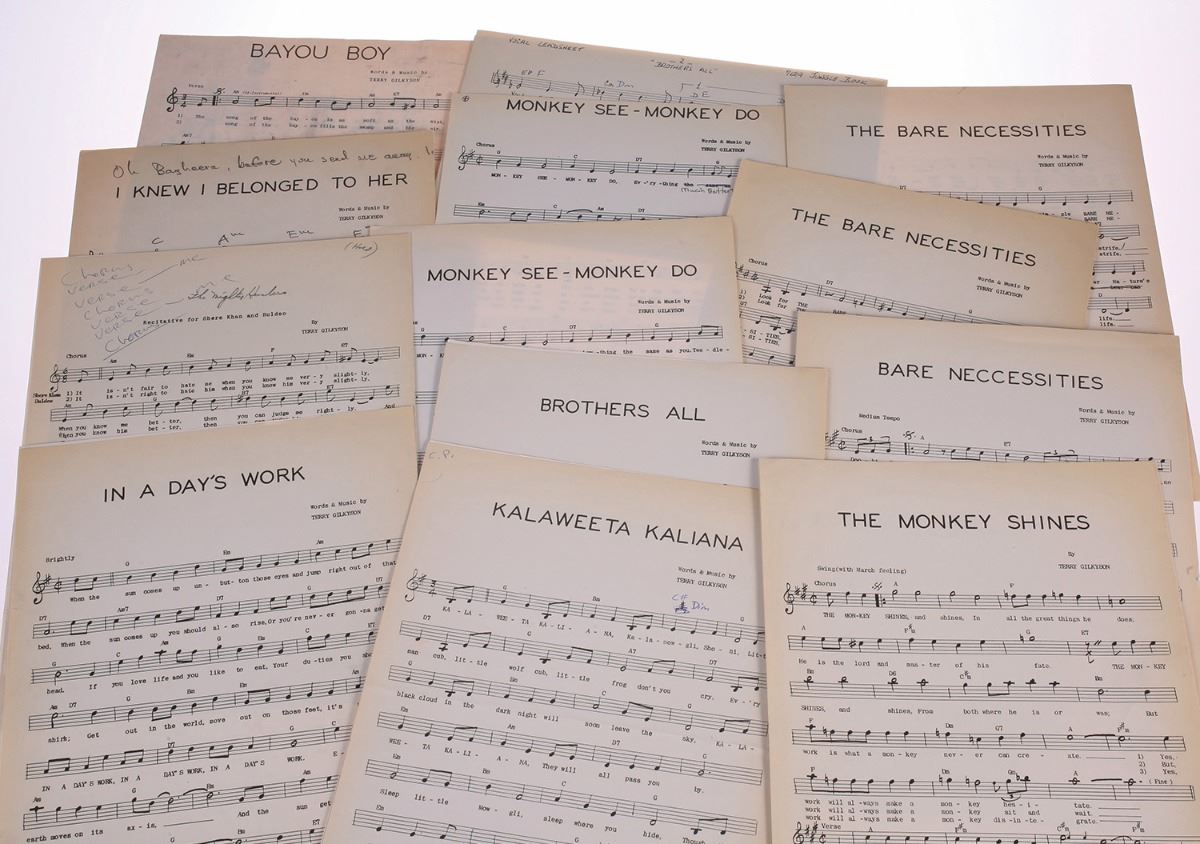 (Walt Disney Studios, 1964) Lot of three (3) master records and sheet music (14 pieces) from Terry Gilkyson. These acetates include recordings of the songs Gilkyson wrote for the earlier darker version of the film. They include his original version of "The Bare Necessities" as sung by Thurl Ravenscroft, as well as the later Phil Harris version. An incredible look at the early production work and direction of the film. All acetates are in very good playable condition.