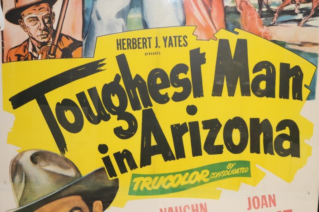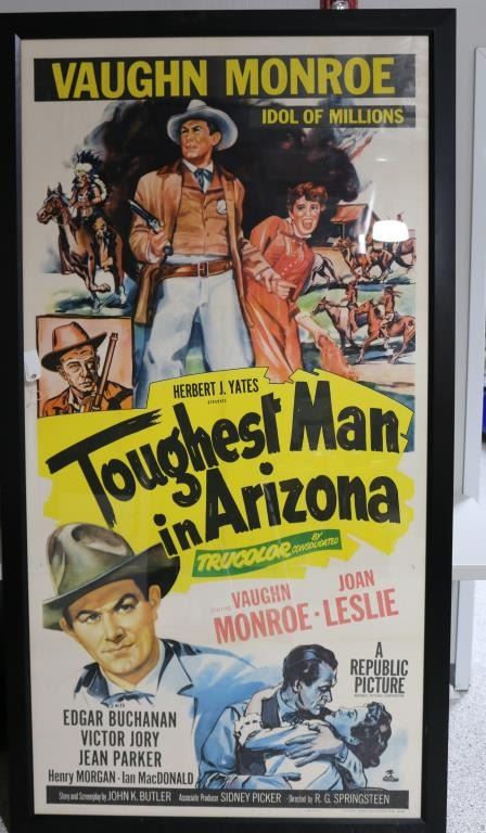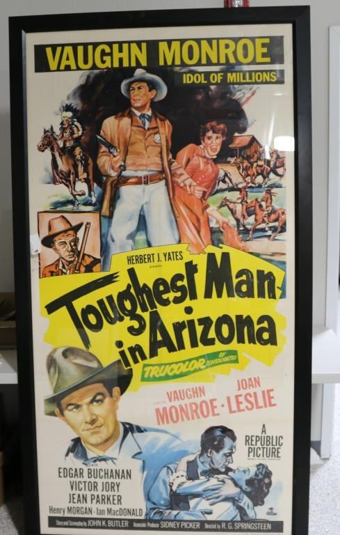"The Toughest Man In Arizona" dated 1952, starring Vaughn Monroe and Joan Leslie in a Republic Film, numbered 52/387, image size 79"x40.5" In black frame. Shipping is the responsibility of the buyer and this is considered a large item.