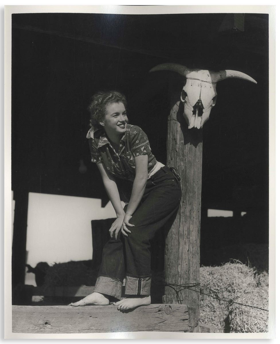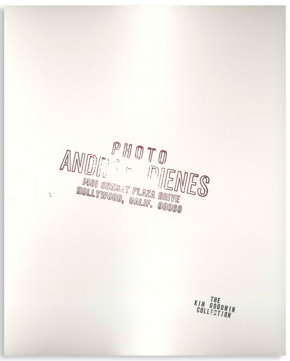 Original 8" x 10" silver-gelatin double-weight photograph of the iconic Marilyn Monroe, taken by Andre de Dienes in 1945 during one of their first photo shoots, with Marilyn then still known as Norma Jeane Baker. Satin-finish double-weight photograph has de Dienes' backstamp, as well as stamp of noted photo collector and Marilyn doll designer Kim Goodwin. Minor buckling, otherwise near fine condition.