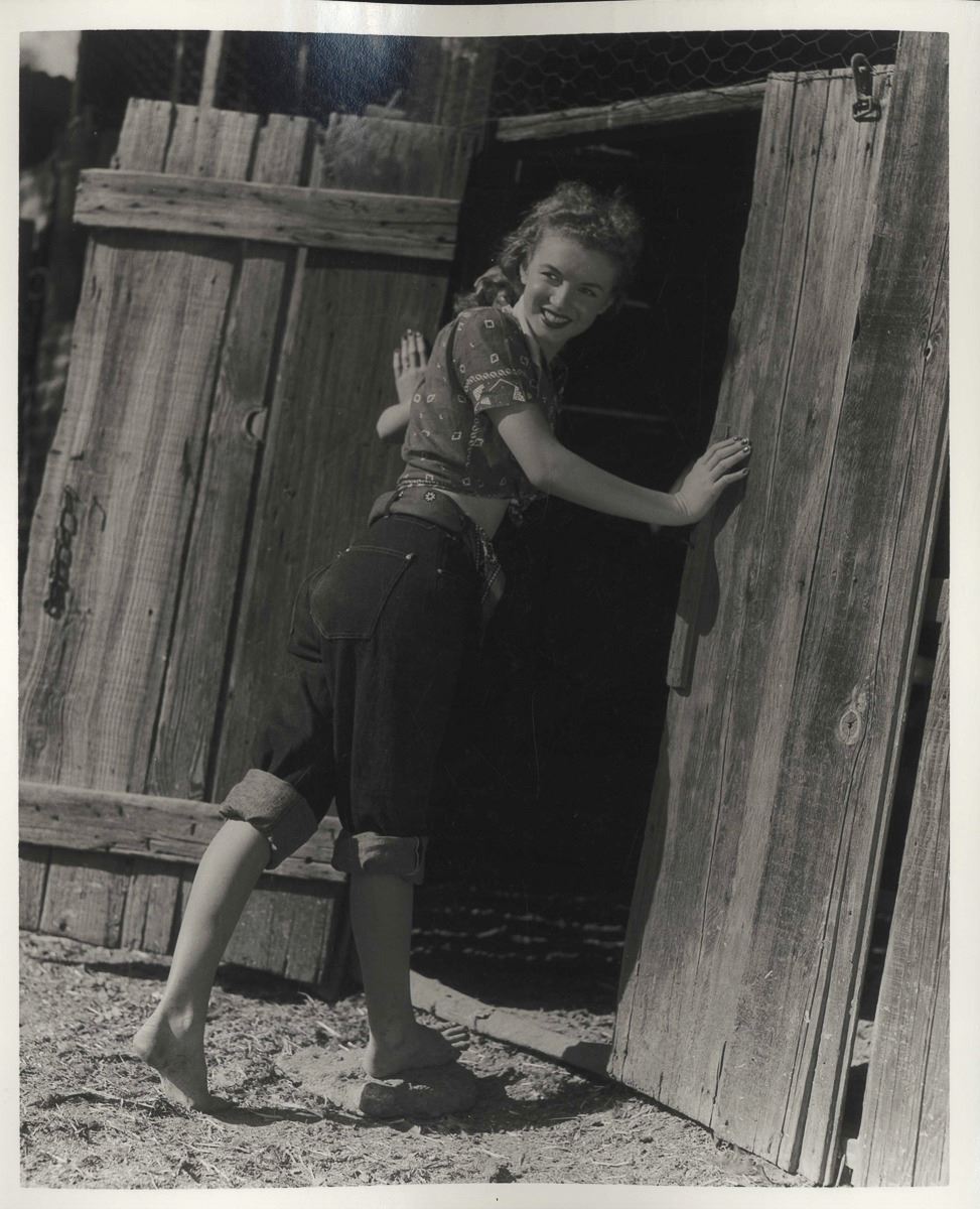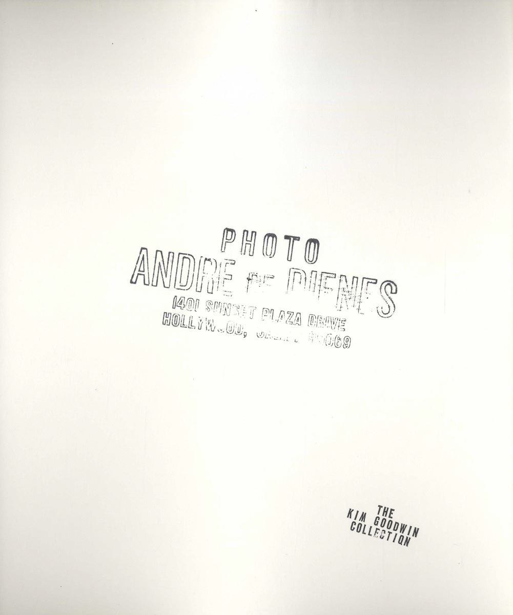 Original 8" x 10" silver-gelatin double-weight photograph of the iconic Marilyn Monroe, taken by Andre de Dienes in 1945 during one of their first photo shoots, with Marilyn then still known as Norma Jeane Baker. Satin-finish double-weight photograph has de Dienes' backstamp, as well as stamp of noted photo collector and Marilyn doll designer Kim Goodwin. Minor buckling, otherwise near fine condition.
