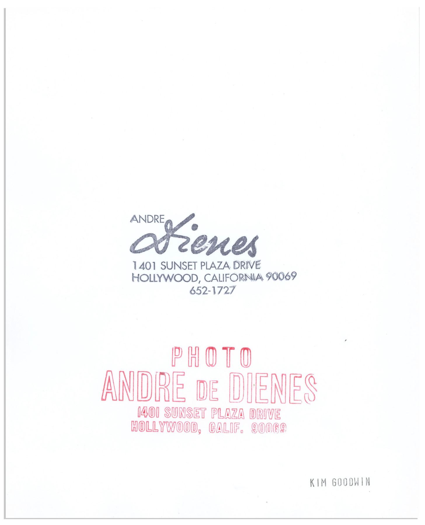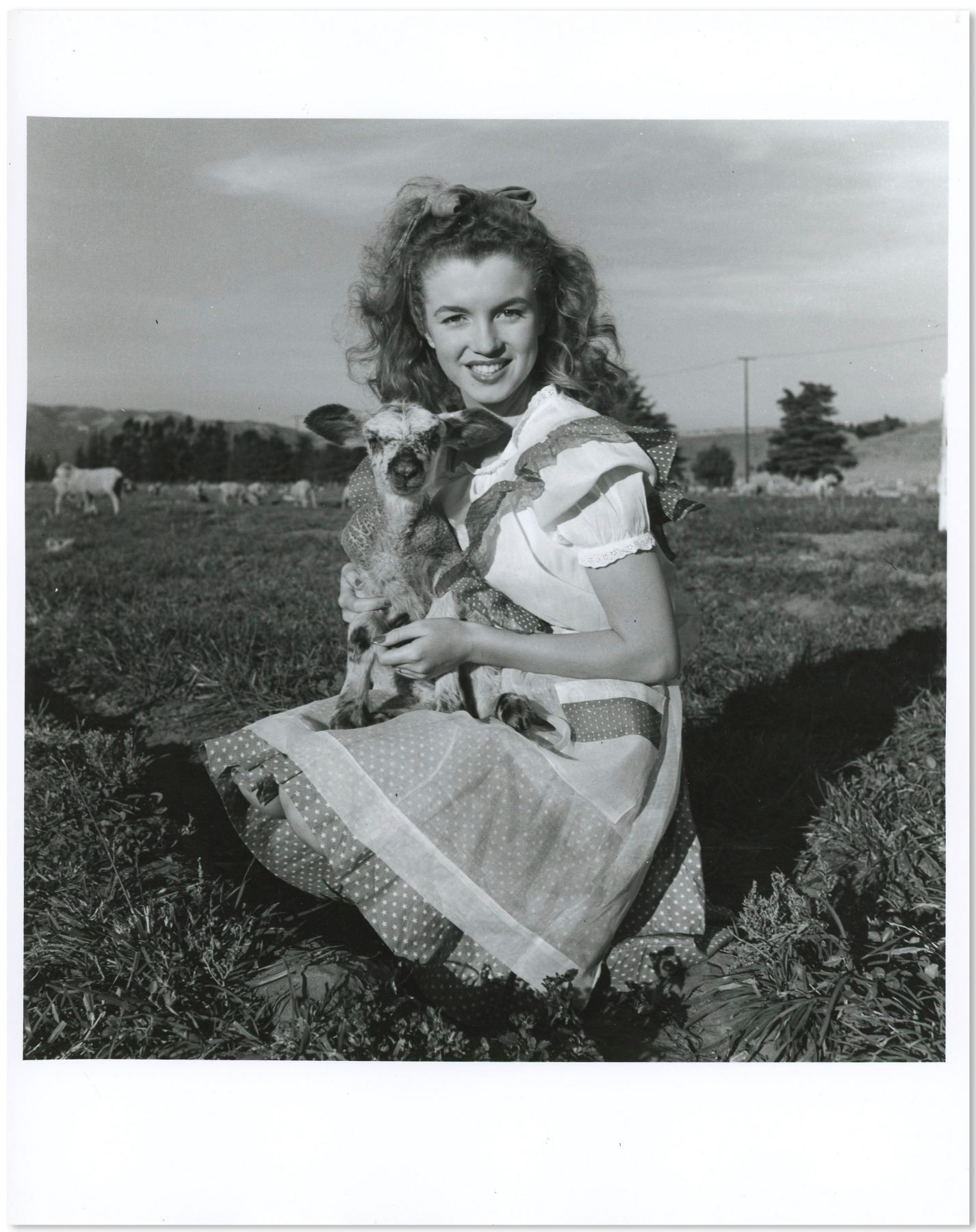 Original 8" x 10" silver-gelatin double-weight photograph of the iconic Marilyn Monroe, taken by Andre de Dienes in 1945 during one of their first photo shoots, with Marilyn then still known as Norma Jeane Baker. Satin-finish double-weight photograph has de Dienes' backstamps, as well as stamp of noted photo collector and Marilyn doll designer Kim Goodwin. Minor buckling, otherwise near fine condition.