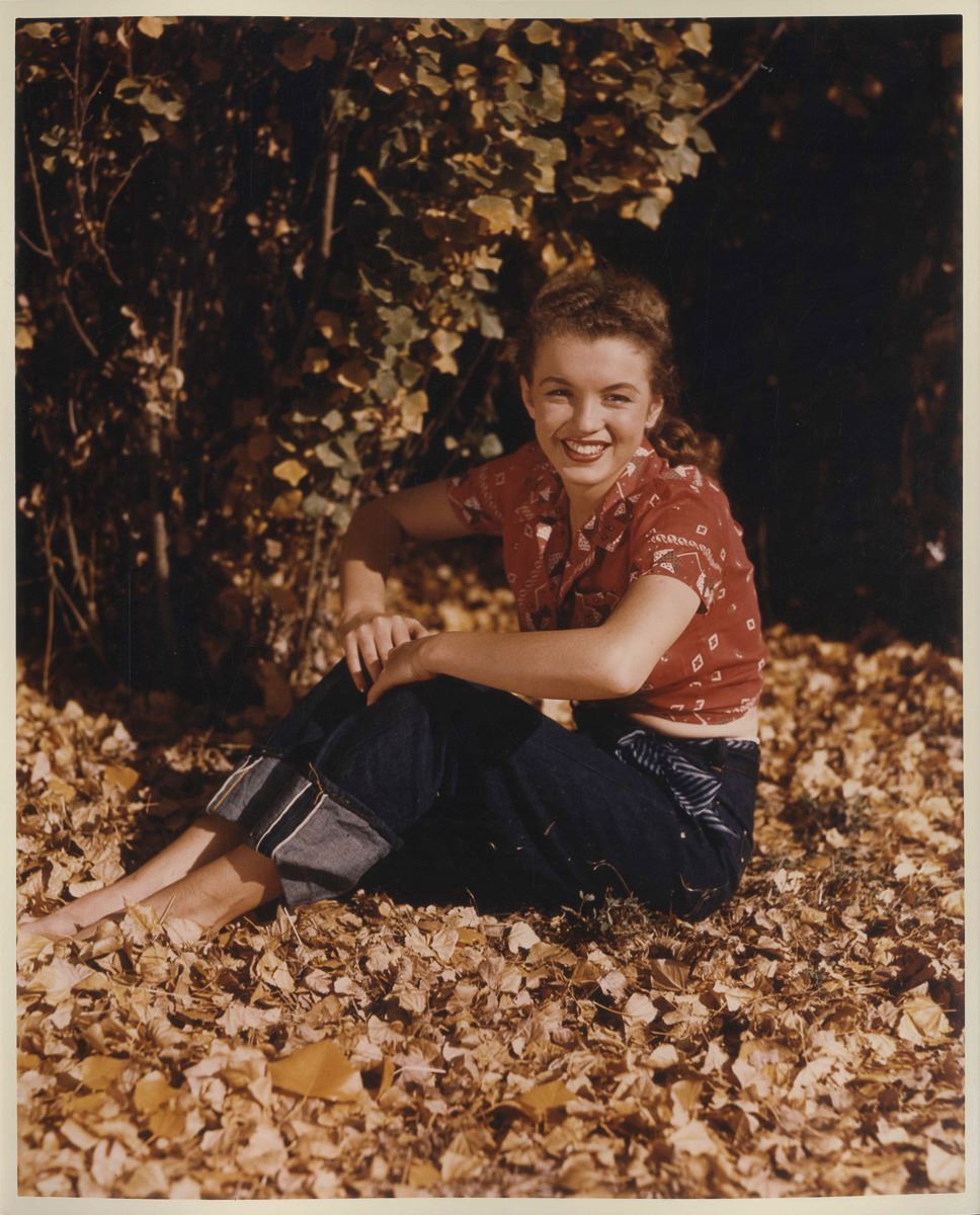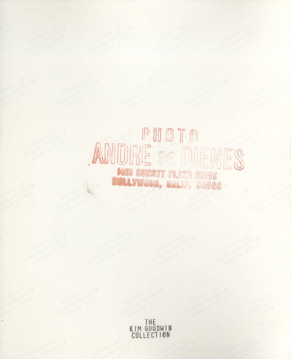 Original 8" x 10" silver-gelatin photograph of the iconic Marilyn Monroe, taken by Andre de Dienes in 1945 during one of their first photo shoots, with Marilyn then still known as Norma Jeane Baker. Glossy photograph on Kodak paper has de Dienes' backstamp, as well as stamps of noted photo collector and Marilyn doll designer Kim Goodwin, and Jerry Ohlinger's Movie Material Store, Inc. Near fine condition.