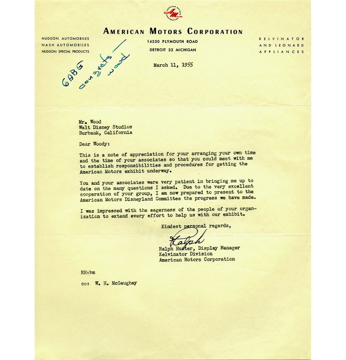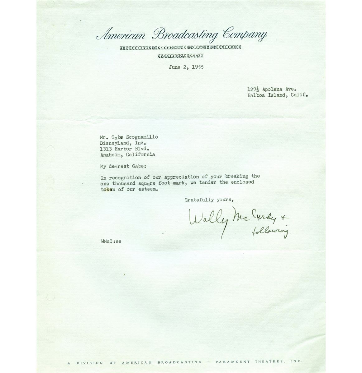 (Disneyland, 1955) Wonderful grouping of (9) pages of correspondence and in-house memos between Tomorrowland Art Director Gabriel Scognamillo and sponsors of exhibits in the land, including American Motors, Kaiser Aluminum, ABC, and the American Dairy Association. Dating between March and June of 1955, the letters and memos illustrate how close to its opening Tomorrowland was still being developed. All measure 8.5”x11”. In very good condition with expected edge wear and yellowing.