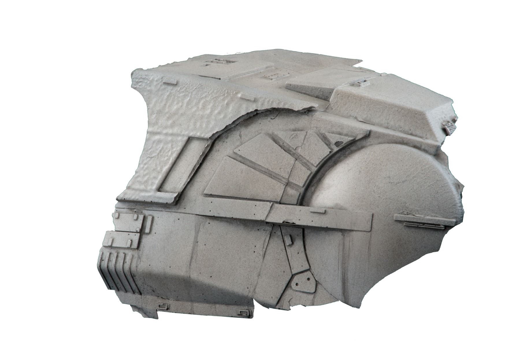 392. Original AT-AT miniature cockpit fragment from the production of Star Wars: The Empire Strikes Back. (TCF, 1980) Original 11 x 8 in. cockpit fragment of the fearsome Imperial AT-AT (All Terrain Armored Transport) seen during the assault on the Rebel base on Hoth. This vintage production casting was fished out of the trash bin during production in 1979 by a current Hollywood FX artist at the original Industrial Light & Magic facility on Valjean Avenue (Van Nuys, California). The fragment was later painted and secured to a wooden display base. $800 - $1,200