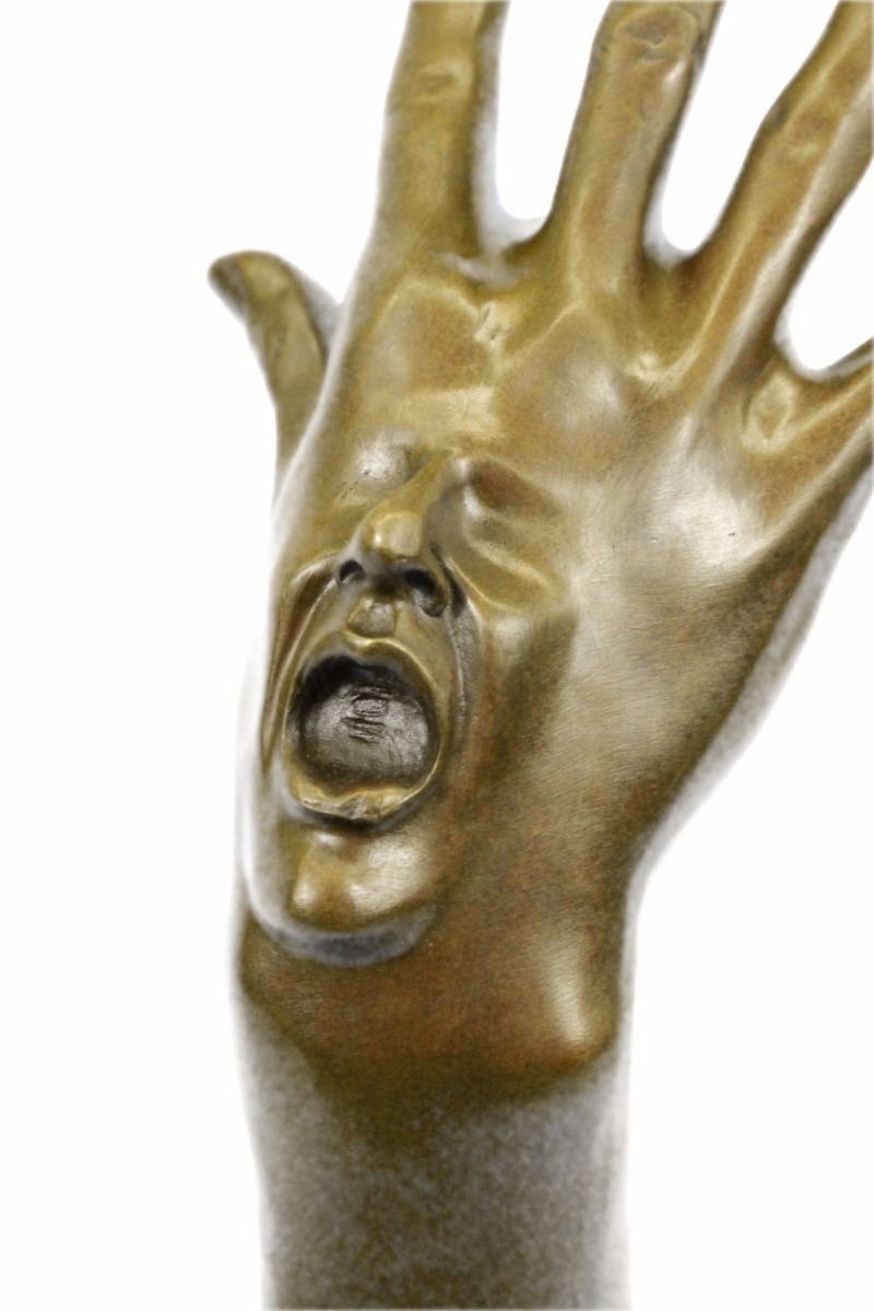 This Extravagant And Abstract Piece Was Designed And Made By Bronze, It Features A Realistic Looking Human Hand And Forearm With The Wrist Slightly Bent And Fingers Spread Apart. The Hand Is Offset By An Intricate Human Nose And Mouth Fused Into The Top Of The Hand Which Immediately Attracts The Eye. This Piece Keeps You Guessing And Using Your Imagination. It'S As If The Artist Was Trying To Convey An Emotion Of Deep Sorrow Or Anger, Possibly Even Pain. It Is Truly One Of A Kind. This Brown Patina Was Cast Using The "Lost Wax Method. Bronze Dimensions With Marble Base: Height 14 X Width 7 inches. Weight: 8 Lbs.