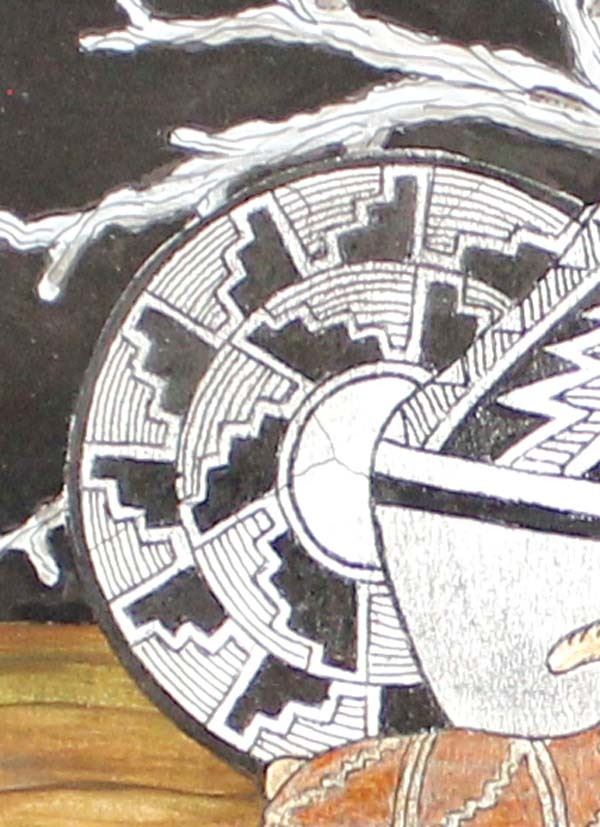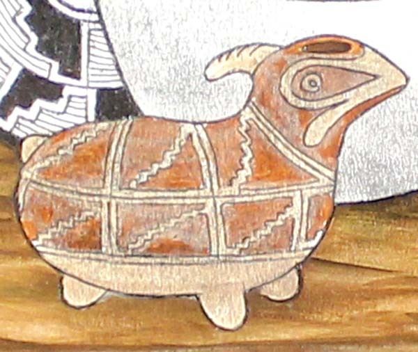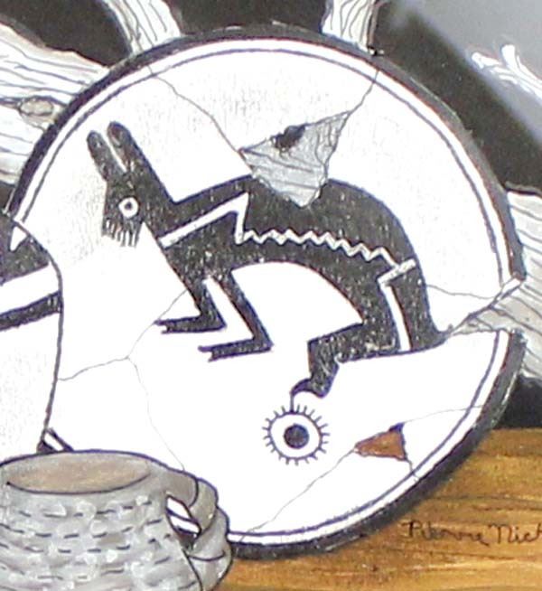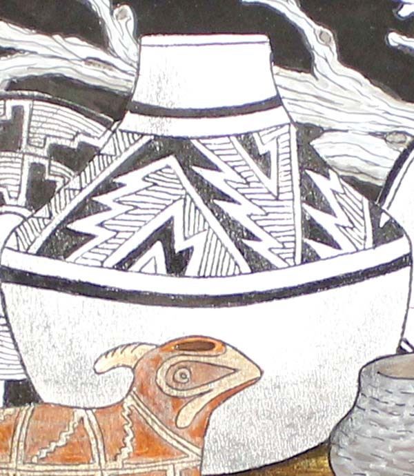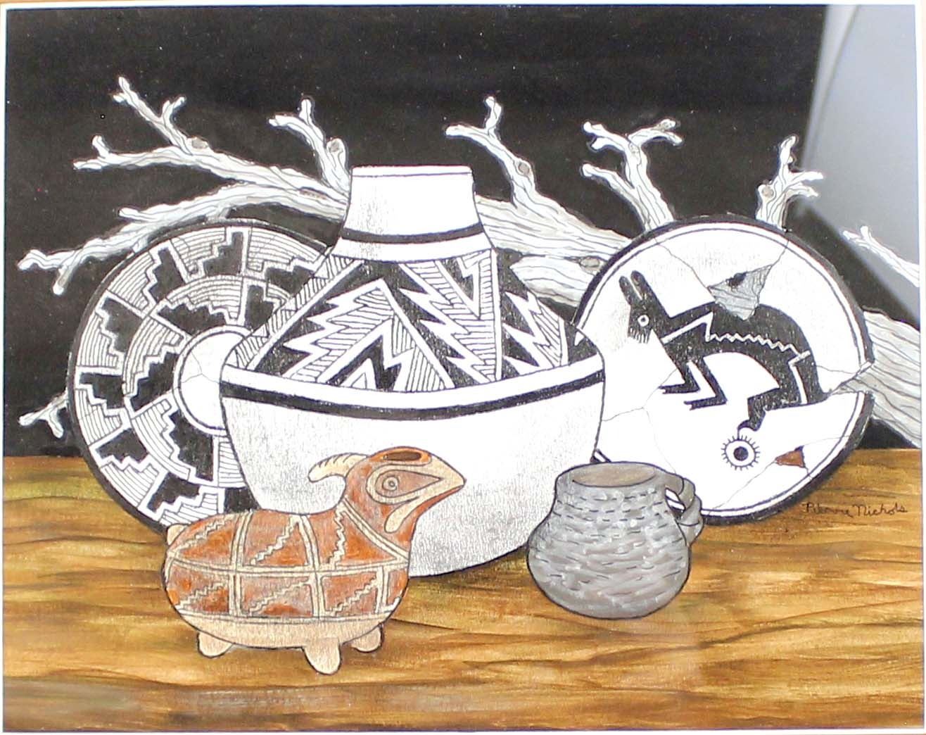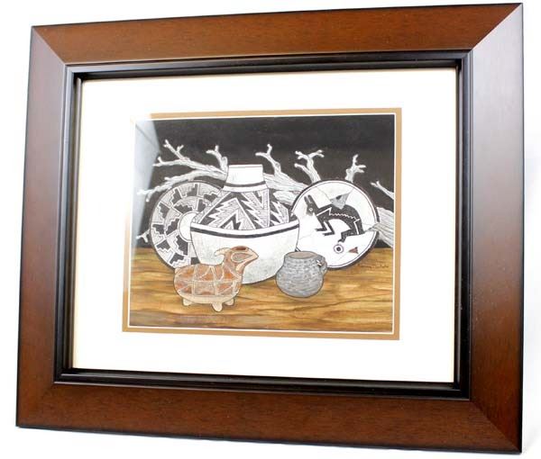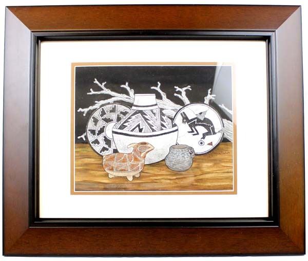 Original Acrylic & Ink Painting by Pierre Nichols, features Mimbres designed pottery, professionally framed, matted, and under glass, visual measures 9.5'' x 7.5'', overall framed measurement of 18'' x 15'' and is signed by the artist, FYI: Pierre Nichols, is a Silver City, multi-media artist best known for his years of making reproductions of Mimbres pottery using gourds. His work is collected by many, as well as by professionals in the field of archeology. Over a dozen of his gourd reproductions are a major part of the permanent display at the Mimbres Heritage Center Museum, located in the Mimbres Valley, New Mexico. Continuing with his love for the Mimbres culture, he has done beautifully detailed paintings of the Mimbres pottery, as large pieces as well as some very special small miniatures, some of which we have here for the auction. Twelve miniatures, each hand inked and painted. A wonderful collection if you are lucky enough to get them all. Also of interest are his ''nicho'' inspired contemporary devotionals which he has made in beautiful detail, often using inlays of brass, and recycled woods etc. Pierre continues to offer artwork through galleries, arts shows in surrounding states and his website, as both an artist as well as a published author.''