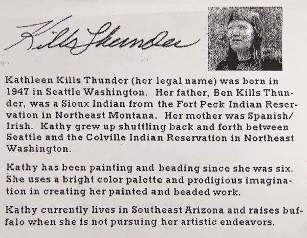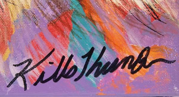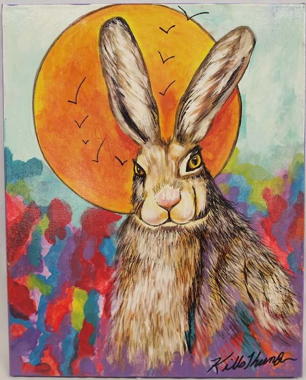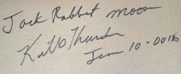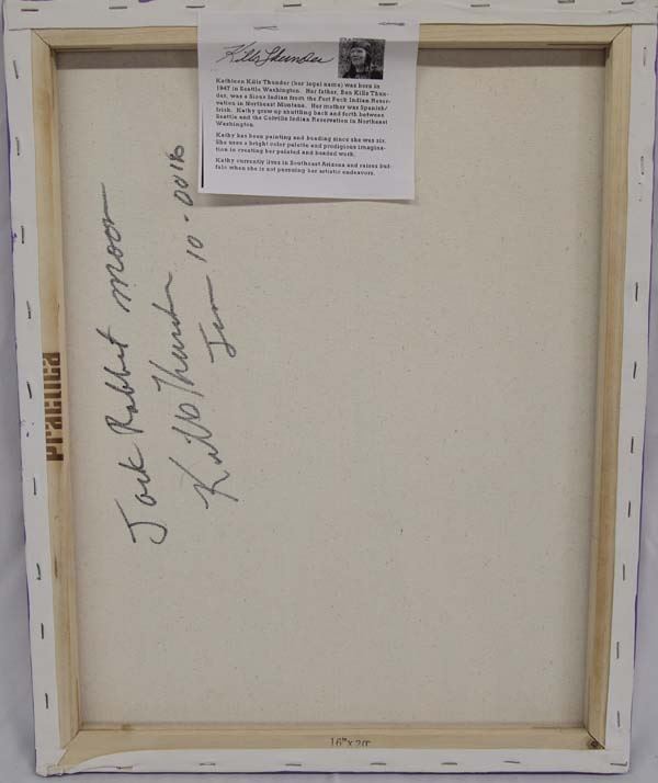 June 2015 Original Acrylic Jack Rabbit Moon by Kills Thunder, measures 16'' x 20'', signed on front and back, Artist Bio: Kathleen Kills Thunder (her legal name) was born in 1947 in Seattle, WA. Her father, Ben Kills Thunder, was a Sioux Indian from the Fort Peck Indian Reservation in NE Montana. Her mother was Spanish/Irish. Kathy grew up shuttling back and forth between Seattle and the Colville Indian Reservation in NE Washington. Kathy has been painting and beading since she was six. She uses a bright color palette and prodigious imagination in creating her painted and beaded work. Kathy currently lives in SE Arizona and raises buffalo when she is not pursuing her artistic endeavors.