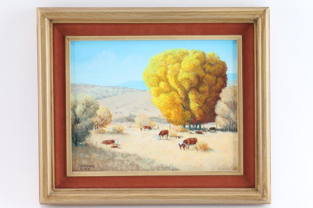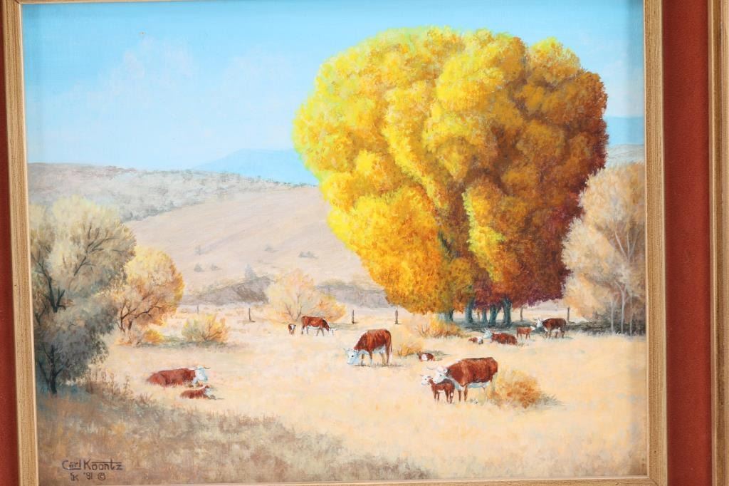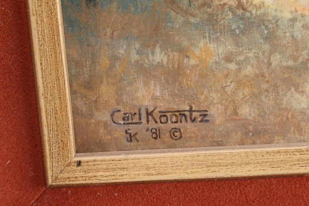 By Carl Koontz, titled "Near". Matted and framed, measures approximately 13" x 11". Signed lower left corner and dated '81. Carl Koontz (1925-1995) was from the Iron Springs Area in Prescott, Arizona. This piece is from The Phippen Art Museum.
