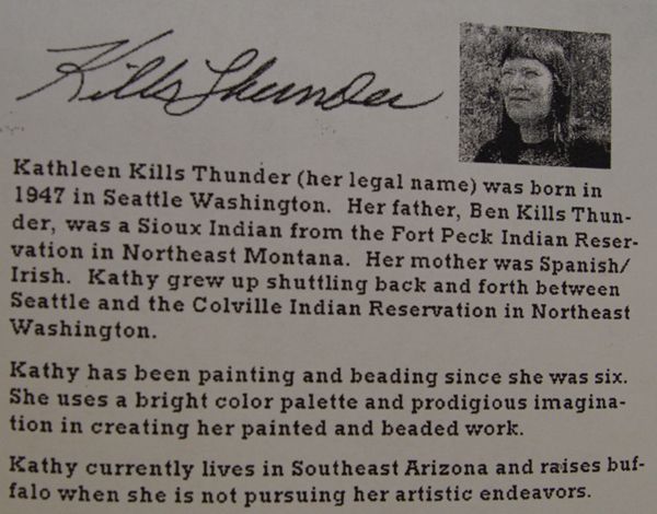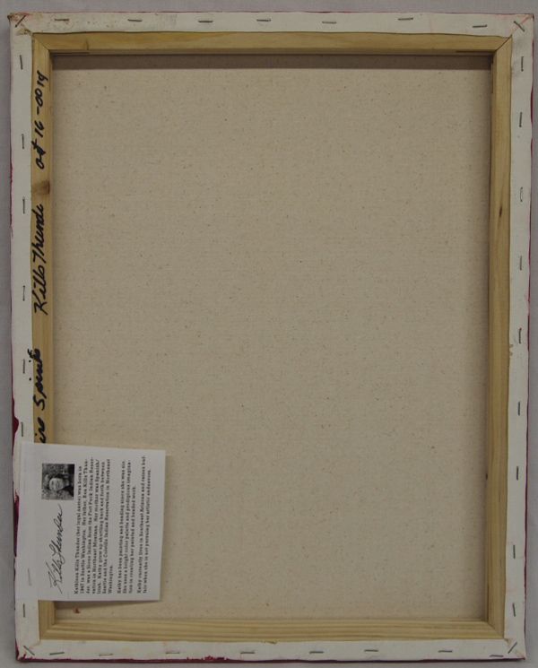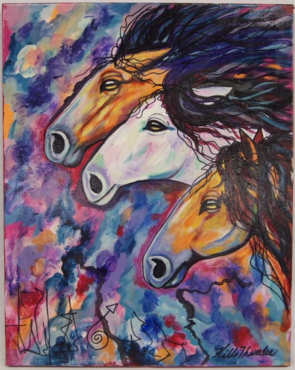 Original Fire Spirits by Kills Thunder, measures 20'' x 16'', Artist Bio: Kathleen Kills Thunder was born in Seattle, Washington. Kathy has been painting and beading since she was six. She uses bright color palette and prodigious imagination in creating her painted and beaded work. Kathy currently lives in Southeast Arizona and raises buffalo when she is not pursuing her artistic endeavors.