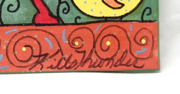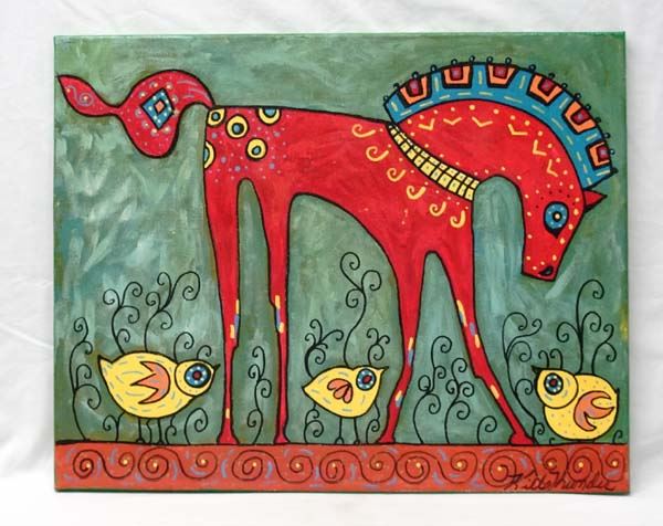 2015 Original Acrylic Painting ''My 3 Little Chicks'' by Kathy Kills Thunder, measures 20'' x 16'', signed by artist, vibrantly painted, Artist Bio: Kathleen Kills Thunder (her legal name) was born in 1947 in Seattle, WA. Her father, Ben Kills Thunder, was a Sioux Indian from the Fort Peck Indian Reservation in NE Montana. Her mother was Spanish/Irish. Kathy grew up shuttling back and forth between Seattle and the Colville Indian Reservation in NE Washington. Kathy has been painting and beading since she was six. She uses a bright color palette and prodigious imagination in creating her painted and beaded work. Kathy currently lives in SE Arizona and raises buffalo when she is not pursuing her artistic endeavors.