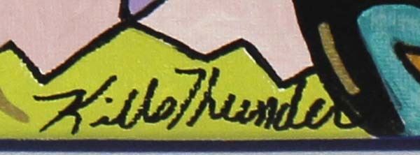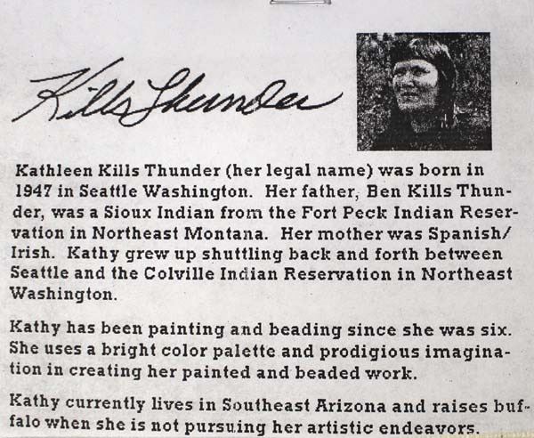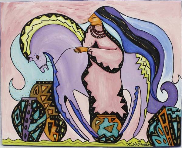 Original Acrylic Painting ''Ituha'' (Sturdy Oak) by Kathy Kills Thunder, signed by the artist and measures 16'' x 20'', Artist Bio: Kathleen Kills Thunder (her legal name) was born in 1947 in Seattle, WA. Her father, Ben Kills Thunder, was a Sioux Indian from the Fort Peck Indian Reservation in NE Montana. Her mother was Spanish/Irish. Kathy grew up shuttling back and forth between Seattle and the Colville Indian Reservation in NE Washington. Kathy has been painting and beading since she was six. She uses a bright color palette and prodigious imagination in creating her painted and beaded work. Kathy currently lives in SE Arizona and raises buffalo when she is not pursuing her artistic endeavors.