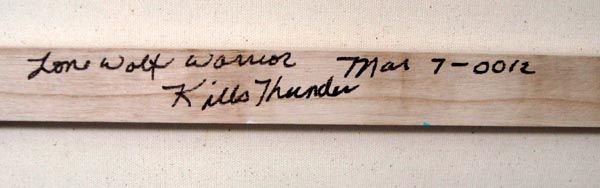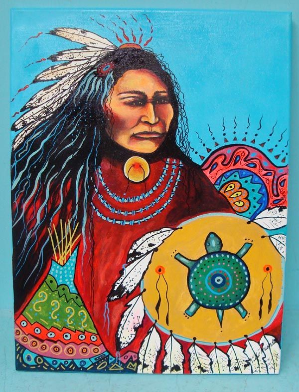Original Acrylic Painting on Canvas-Kills Thunder. ''Lone Wolf Warrior''. Warrior with shield and turtle totem. 24''H x 18''W. Signed and dated by artist on frame and in front. Painted with the vibrant colors typical of Kills Thunder.