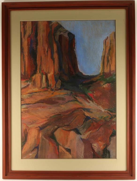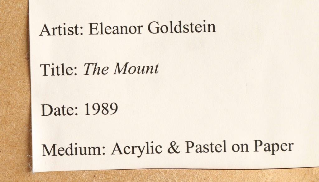 Goldstein "The Mount" signed lower right. Image measures 37"x25 1/2" in double mat and wood frame. From the Pfizer Corporation Collection. Eleanor Goldstein is a member of the National Association of Women Artists, and the Upstream Gallery in Hastings, NY, as well as a Signature Member of the Pastel Society of America. Ms. Goldstein is a Wurlitzer Foundation Fellow. Her work was commissioned by the Cathedral of St. John the Divine, NYC; selected by the United States Art in the Embassies Program; exhibited at the Rockefeller Gallery in Pocantico Hills, NY; as well as other galleries and museums in the United States and in private collections abroad. Currently she is developing a body of work inspired by a trip to Greenland the aim of which is to honor the majestic bodies of icebergs predicted to disappear by 2030 due to earth warming.