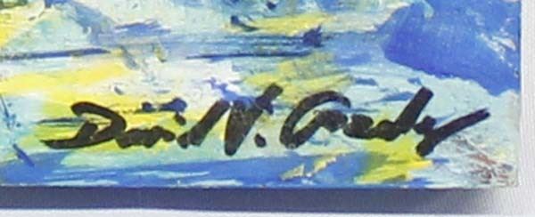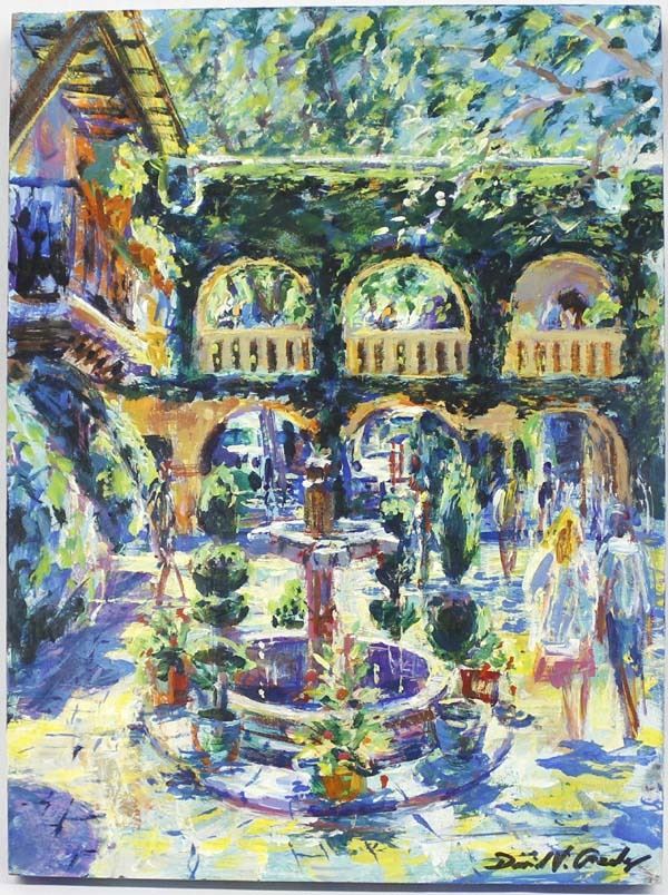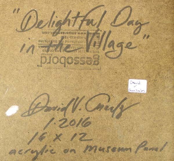 Original Acrylic Painting on Museum Panel ''Delightful Day in the Village'' by David V. Gonzales, measures 12'' x 16'' and is signed by the artist (on front and on back), FYI: ''David V. Gonzales was born on February 3, 1971, on a U.S. Air Force Base in Wiesbaden, Germany. He grew up in Santa Fe, N.M. Gonzales' early work reflects his heritage, rich in Native American and Hispanic Cultural Traditions, but quickly expanded to include many styles and a multitude of mediums.''