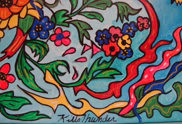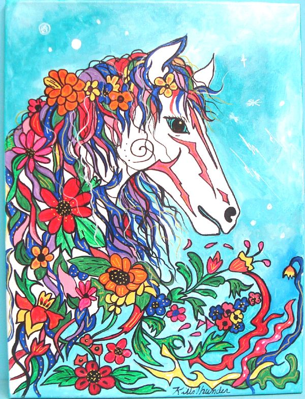 Original Acrylic on Canvas-Kills Thunder. 24''H x 18''W, this horse painting is painted in the bright colors and style traditional to the Arizona artist.