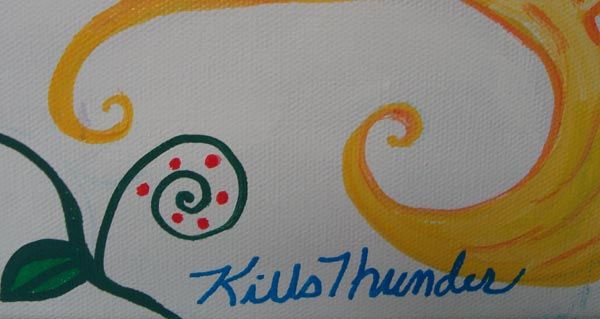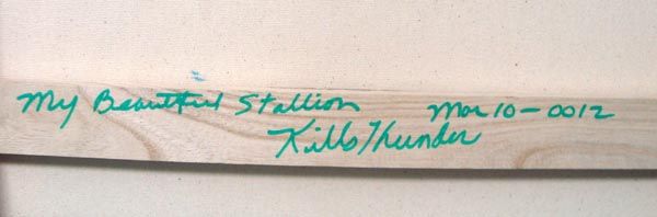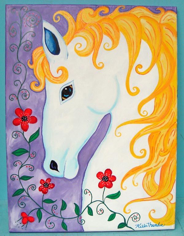 Original Acrylic on Canvas Painting-Kills Thunder. ''My Favorite Mare'' . A white mare frolics in a flowered background. 24''H x 18''W. Signed and dated by artist on frame and front. Painted with the vibrant colors typical of Kills Thunder.