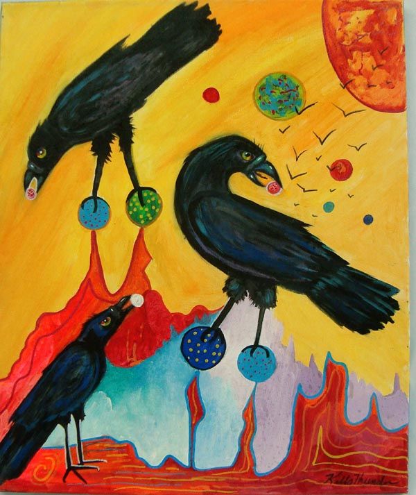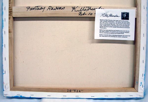 Original Acrylic on Canvas Painting-Kills Thunder. ''Fantasy Ravens'' measures 24''H x 20''W. Signed, dated and painted in the bold colorful style traditional to this Arizona artist.