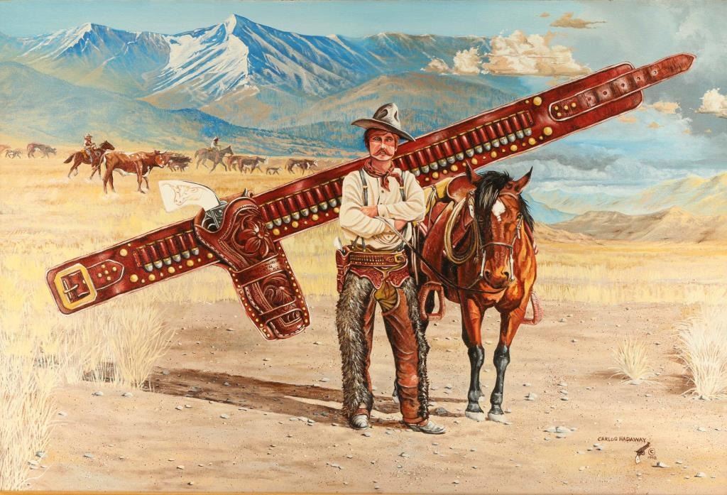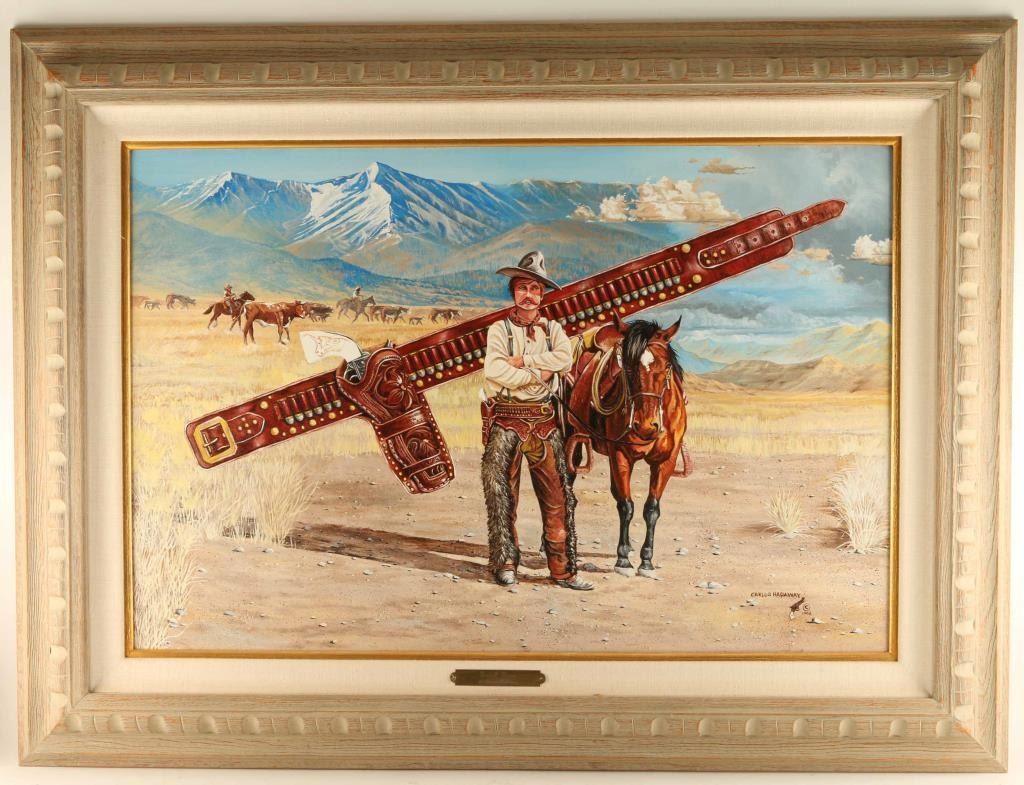 From the Jim Lockwood Prescott Leather Maker Collection, by noted AZ artist Carlos Hadaway. Entitled "Trail Boss". Depicts our consignor with his horse with large single rig holster that reads "Jim Lockwood Jr. Maker". hand signed in the lower right hand corner and dated 1998. 36" by 24". IN wood frame.