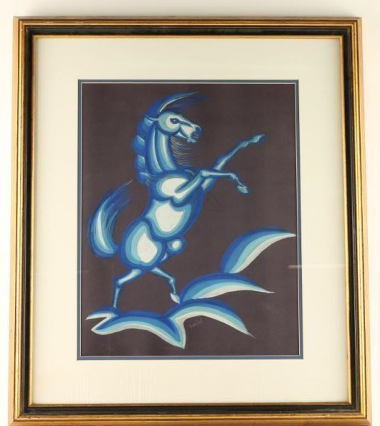 by indian artist Tsinajinie depicting a blue horse image size is 19X15. Born in Rough Rock, Arizona, Andy Tsinnajinnie was an Indian artist and illustrator who maintained a studio in Scottsdale, Arizona. He was a member of the Navajo Salt River Bend Indian tribe, and the translation of his last name, which has been spelled in several ways, is "Little Grey." He studied art at the Fort Apache School in Santa Fe, New Mexico, and graduated in 1936. He painted large murals for the WPA in Arizona and New Mexico including ones for Indian Schools. He served in the U.S. Army Air Force in the South Pacific, and after that was a full-time artist in Scottsdale. He did illustration for the Navajo Agency at Window Rock, for "Arizona Highways" and also for other magazines and books.