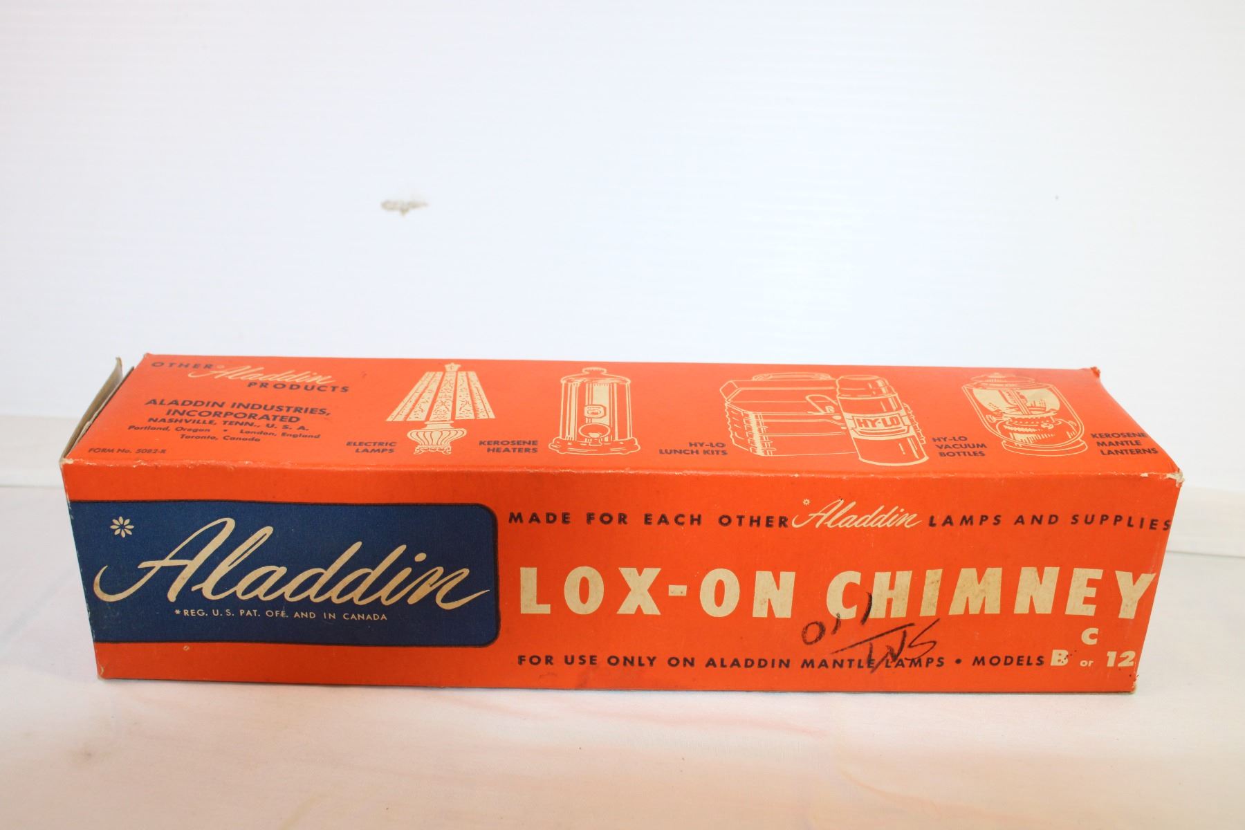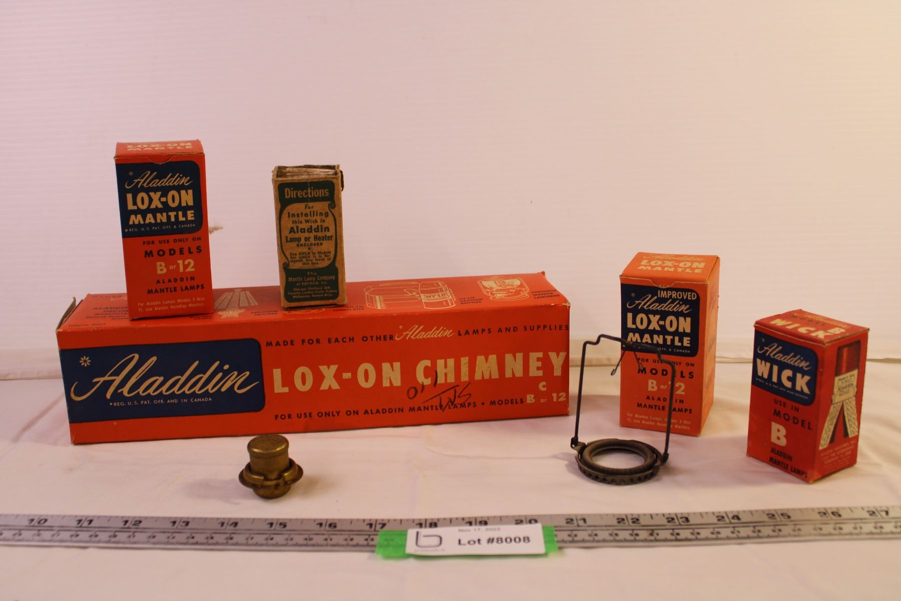Original Aladdin Lox-On Chimney Box + Model “B” Wick in Original Box and Lox-On Mantle for Model “B” or “12” in Original Box, Lox-On Mantle Box , Model 12 Aladdin Wick Cleaner, and Nu-Type Aladdin Wick Box