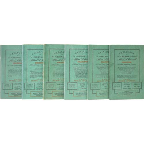 <B>Original Albert A. Grinnell Collection Auction Catalogues 1944 - 1946</B></I>.<BR> This lot consists of six original green card cover catalogues for this much celebrated auction that was conducted by Barney Bluestone of Syracuse, New York. Part IV is missing, but Part I is hand-priced; Parts II; III; and VI have the prices realized and they are hand-priced; Part V (loose binding) is partially hand-priced and it has only a photocopy of the first page of the prices realized; and Part VII is hand-priced. Also, the bid sheet has been cut out of Parts I; II; and III. With the hand-pricing and the loose binding, it makes you wonder if these catalogues were actually at this monumental event that was attended by so few. <BR><BR><b>Shipping:</b> Coins & Currency (<a target="_blank" href="http://www.heritageauctions.com/common/shipping.php">view shipping information</a>)
