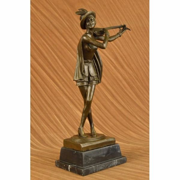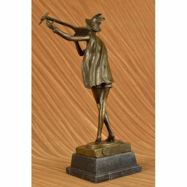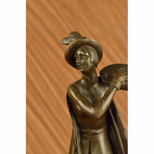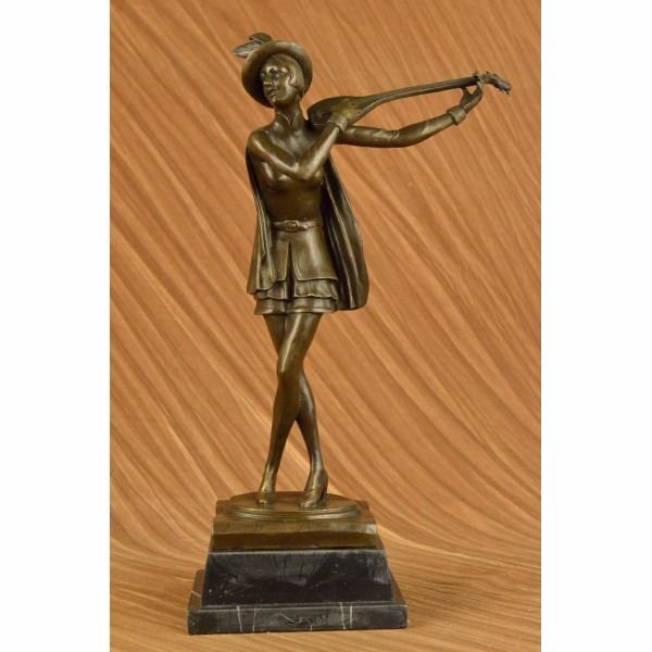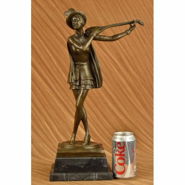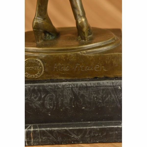 She stands center stage with her hand perched high in the air and tucks her guitar under the crook of her arm. She tilts her head up slightly with pride. She is dressed in thigh high shorts, a close fitting blouse that is belted with a sash around her curvy waist and high heels. A hat sits slanted on her short straight head. 100% bronze and handmade, this brown patina sculpture was cast using the "Lost Wax Method" and mounted on a marble base and is signed by artist Aldo Vitaleh Condition : This sculpture is in perfect condition. Bronze Dimensions with Marble Base:Height 19" x Width 9" Marble Dimensions:7" X 5" Height without base: 16 1/2" Weight : 15 LBS Inventory : 17XN225271