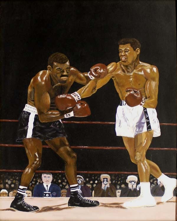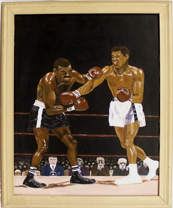 Original Ali - Fraiser Fight Painting, visual measures 30'' x 24'', framed and unsigned, on canvas, from the fight in San Francisco in 1975
