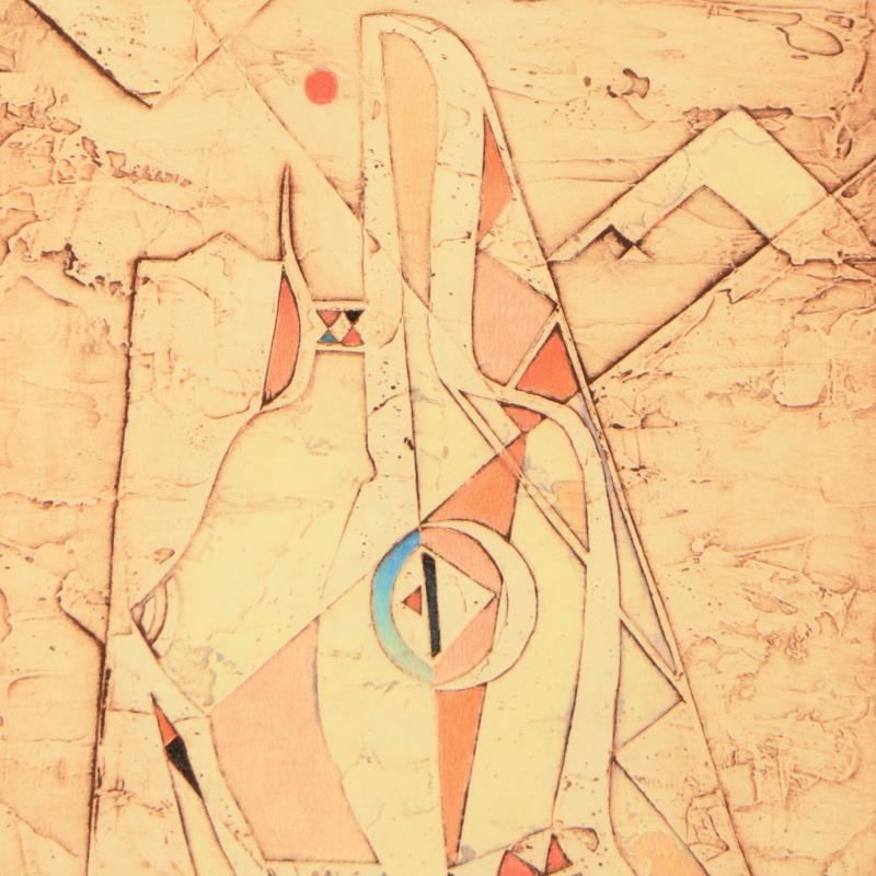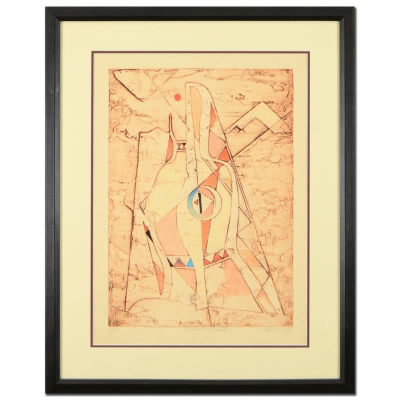 "Ancient Legend" is a unique variation mixed media linocut from an AP edition on paper by Neal Doty (1941-2016), hand signed by the artist. This piece comes custom framed. Includes Certificate of Authenticity. This piece comes from Neal Doty's personal collection and was received directly from Doty's Estate. Measures approx. 26" x 33" (frame), 16" x 22" (image).