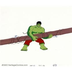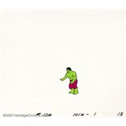 Original Animation Art for the Hulk Cartoon (undated). "Doc Bruce Banner, belted by Gamma rays..." So was introduced the Incredible Hulk in his first cartoon appearance in the 1960s. The two cels offered here are probably from the fondly remembered 1982 Hulk cartoon, although that has not been verified. Both cels are on standard animation acetate, measuring approximately 12.5" x 10.5" and are in excellent condition. The Hulk holding a telephone pole has an image area of approximately 12.5" x 5.5", while the other cel has a smaller 2" x 3" image area. Hand-painted cels are becoming more and more rare in the marketplace with the advent of computer animation, making this an excellent opportunity to acquire this piece of TV history. Important notice: We expect to be auctioning lots at the rate of 200-250 per hour. Sometimes eBay Premier live bid software cannot keep up with that pace, so we strongly recommend that you place a realistic proxy bid now as insurance to avoid disappointment. Also please note that all Heritage/CAA lots purchased through eBay Premier carry a 20% Buyer's Premium.