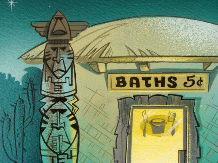 This original hand-painted background is from the Nickelodeon TV show Ren & Stimpy. The show follows two characters - Ren, a crazy Chihuahua - and - Stimpy, an incredibly stupid cat - as they think up to all kinds of hair brained schemes and get themselves into some sticky situations. The Ren and Stimpy Show debuted in August 1991 with a two-part episode, 'Stimpy's Big Day / The Big Shot' and became an instant hit. It was the third Nicktoon ever to be aired on the Network alongside Doug and Rugrats. Nothing is free anymore, your even been charged to take a bath.Original Production Background Overall Size: 10 1/2" x 13" Excellent condition Original Production Backgrounds are used in the making of the final version of animated productions. The background establishes the location and the overall good mood of the scenee. Typically, a background layout artist creates a drawing to establish the content of the scene, placement of characters, perspective and camera angle. Based on this drawing, the background artist creates a preliminary painting to confirm all of the scenes details, then the final production background which is used in the filming of the scene. When these backgrounds are individually photographed behind the progression of production cels, and projected at a rapid succession, the images in the foreground appear to move, creating an animated scene. The background is to be matted and framed. It is a colored background with the animator's notations shown at the bottom.