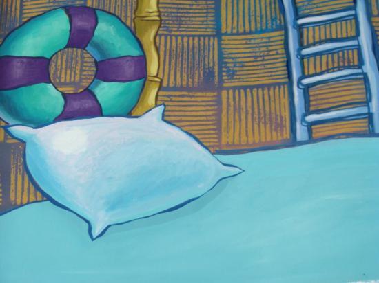 This original hand-painted background and animation cel is from the Nickelodeon TV show SpongeBob Squarepants. The story takes place under the deep blue sea in Bikini Bottom, where SpongeBob resides. SpongeBob, who is a yellow, porous sponge, is your typical happy-go-lucky character, as he is always cheerful and enjoys making people laugh. Patrick Star, SpongeBob's neighbor who is a starfish, is your average children's show idiot, as he boasts knowing nothing and is often getting himself into ridiculous situations. Between the homes of these two lies the home of the miserable Squidward, an octopus, who is known for being grouchy and playing tricks on SpongeBob and Patrick. Both SpongeBob and Squidward work at the Krusty Krab, a fast food business run by the greedy money-loving Mr. Krabs, a crab, the arch rival of the evil, possibly misunderstood, Plankton. Another neighbor, Sandy Cheeks, an athletic squirrel who normally wears an astronaut's space suit, was introduced in "Tea at the Treedome." She spends most of her time inventing and experimenting. The cel and background is a picute of SpongeBob's bedroom.Original Production Background and Animated Cel Overall Size of Background: 9 1/2" x 16"Overall Size of Cel: 10 1/4" x 17 1/4" Excellent condition This is an original hand-painted cel set-up used in the production of an episode of "SpongeBob SquarePants." Each one-of-a-kind set-up represents a slight change in position of the characters. When individually photographed and projected in rapid succession, the images appear to move.