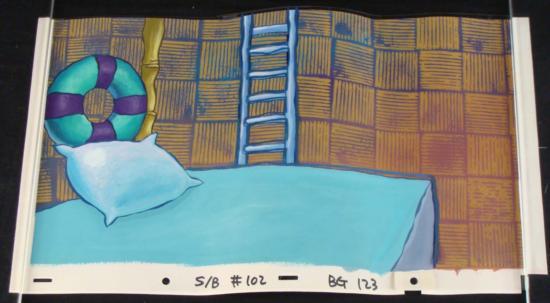 This original hand-painted background and animation cel is from the Nickelodeon TV show SpongeBob Squarepants. The story takes place under the deep blue sea in Bikini Bottom, where SpongeBob resides. SpongeBob, who is a yellow, porous sponge, is your typical happy-go-lucky character, as he is always cheerful and enjoys making people laugh. Patrick Star, SpongeBob's neighbor who is a starfish, is your average children's show idiot, as he boasts knowing nothing and is often getting himself into ridiculous situations. Between the homes of these two lies the home of the miserable Squidward, an octopus, who is known for being grouchy and playing tricks on SpongeBob and Patrick. Both SpongeBob and Squidward work at the Krusty Krab, a fast food business run by the greedy money-loving Mr. Krabs, a crab, the arch rival of the evil, possibly misunderstood, Plankton. Another neighbor, Sandy Cheeks, an athletic squirrel who normally wears an astronaut's space suit, was introduced in "Tea at the Treedome." She spends most of her time inventing and experimenting. The cel and background is a picute of SpongeBob's bedroom.Original Production Background and Animated Cel Overall Size of Background: 9 1/2" x 16"Overall Size of Cel: 10 1/4" x 17 1/4" Excellent condition This is an original hand-painted cel set-up used in the production of an episode of "SpongeBob SquarePants." Each one-of-a-kind set-up represents a slight change in position of the characters. When individually photographed and projected in rapid succession, the images appear to move.