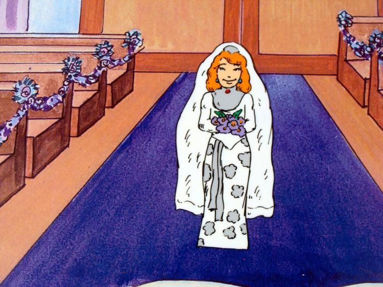 This is an original production cel and reproduction background of a groom. (musical notes) "Here comes the bride, all dressed in white"... * * * Original Animation Cel & Printed Background * * Size of cel: 10 1/2 x 12 1/2 inchesSize of background: 11 x 13 inches * * Condition: Excellent * * * This is an original hand-painted cel. Each one-of-a-kind cel represents a slight change in position of the characters. When individually photographed and projected in rapid succession, the images appear to move. * * To create production cels, the original animator's drawing is transferred onto an acetate cel (by hand-inking and/or photo copying). The cel is then hand-painted on the reverse side. The background accompanying this set-up is a printed reproduction background. * * * * * The cel and background are ready to be matted and framed. The animators notations are located at the bottom of the cel.