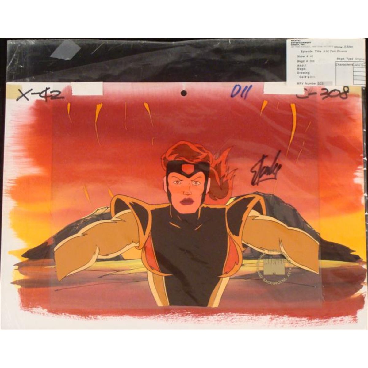 This is an original signed production cel and background from the hit series X-Men. Stan Lee signature is located on the right side of cel in black sharpie. * Under a cloud of increasing anti-mutant sentiment, Professor Xavier creates a haven at his Westchester mansion to train young mutants to use their powers for the benefit of humanity, and to prove mutants can be heroes. Xavier recruited Cyclops, Iceman, Angel, Beast and Jean Grey calling them "X-Men" because they possessed the "x-gene", an ability normal humans lacked. Early issues introduced the team's arch enemy, Magneto and his Brotherhood of Evil Mutants, who would later battle the X-Men for years. * You are now under my command... * * Original Animated Cel Overall Size of the Cel: 10 1/2" x 12 1/2" Overall Size of the background: 10 1/4" x 14 1/4" Excellent Condition This is an original hand-painted cel set-up used in the production of an episode of X-Men titled "Dark Phoenix." Each one-of-a-kind set-up represents a slight change in position of the characters. When individually photographed and projected in rapid succession, the images appear to move. * To create production cels, the original animator's drawing is transferred onto an acetate cel (by hand-inking and/or photo copying). The cel is then hand-painted on the reverse side. The background accompanying this set-up is an original production background. * The cel and original background is ready to be matted and framed. The animators notations are located at the top of the cel and background. A certificate of Authenticity from Marvel is on the back of background. The Marvel Seal is located at the bottom right of the cel. The cel and background are in a protective sleeve An information card about the episode is located at the top right of the protective sleeve. *